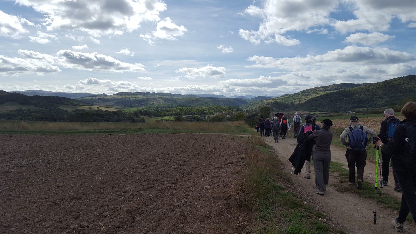 Mercredi 7 octobre : Départ de l’entrée de Ludesse. Pour y arriver, on a traversé ce Sud-Ouest vallonné de Clermont dont on va retrouver le paysage immense dans notre marche. D’abord vers l’Est puis le Sud-Ouest, on voit toujours très loin : Montpeyroux, le haut de la vallée de la Couze Chambon, les buttes de Montaigut ou d’Olloix par des chemins où se succèdent montées et descentes. Nous arrivons à St Julien, reconnaissons le clocheton et la fontaine de la place avant de prendre le parcours qui longe les caves enterrées sur le coteau dont l’autre versant tombe sur la Couze. Avant d’arriver à Montaigut, nous reprenons la direction du Nord sur le GR du pays des Couzes. À notre gauche, le paysage accidenté qui annonce le massif du Sancy, à notre droite toute la plaine de Plauzat qui butte sur le relief du bord d’Allier : un très beau parcours par temps doux et ensoleillé, merci Claude !