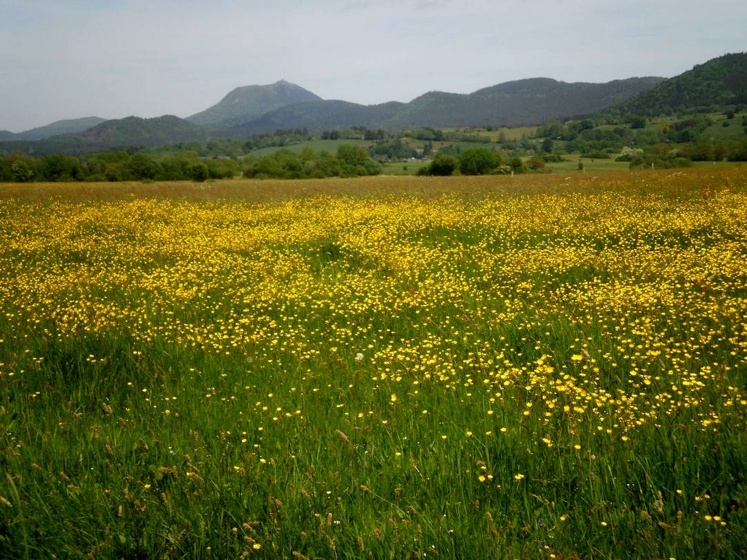 Jeudi 9 juin : Nous sommes tous rapidement sur la grande place d’Aurières, au centre de cette plaine entre Dômes et Sancy. Nous partons vers l’Est : la Sagne, les Grands Prés Courts, et juste avant les Petits Prés Courts, nous revenons vers l’Ouest et le Nord. Les puys au Sud du Puy de Dôme sont très verts, clairs quand ils sont dégagés, sombres quand ils sont boisés, et les prés que nous longeons ont beaucoup d’herbe et de fleurs. Les orages des derniers jours ont rendu la végétation luxuriante. En revenant encore à l’Ouest (au loin, la pointe du roc de Cluzeau), nous traversons la Gigeole qui prend naissance dans un petit étang près du Couhalion et qui traverse Aurières. Nous rejoignons le village, toujours par de grands chemins, le monument aux morts est près de l’église et beaucoup de maisons en pierre sont belles. Aucune côte, vent frais vivifiant, jolie promenade, merci Claude !