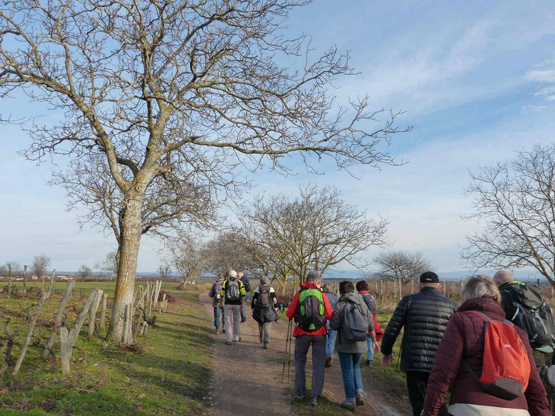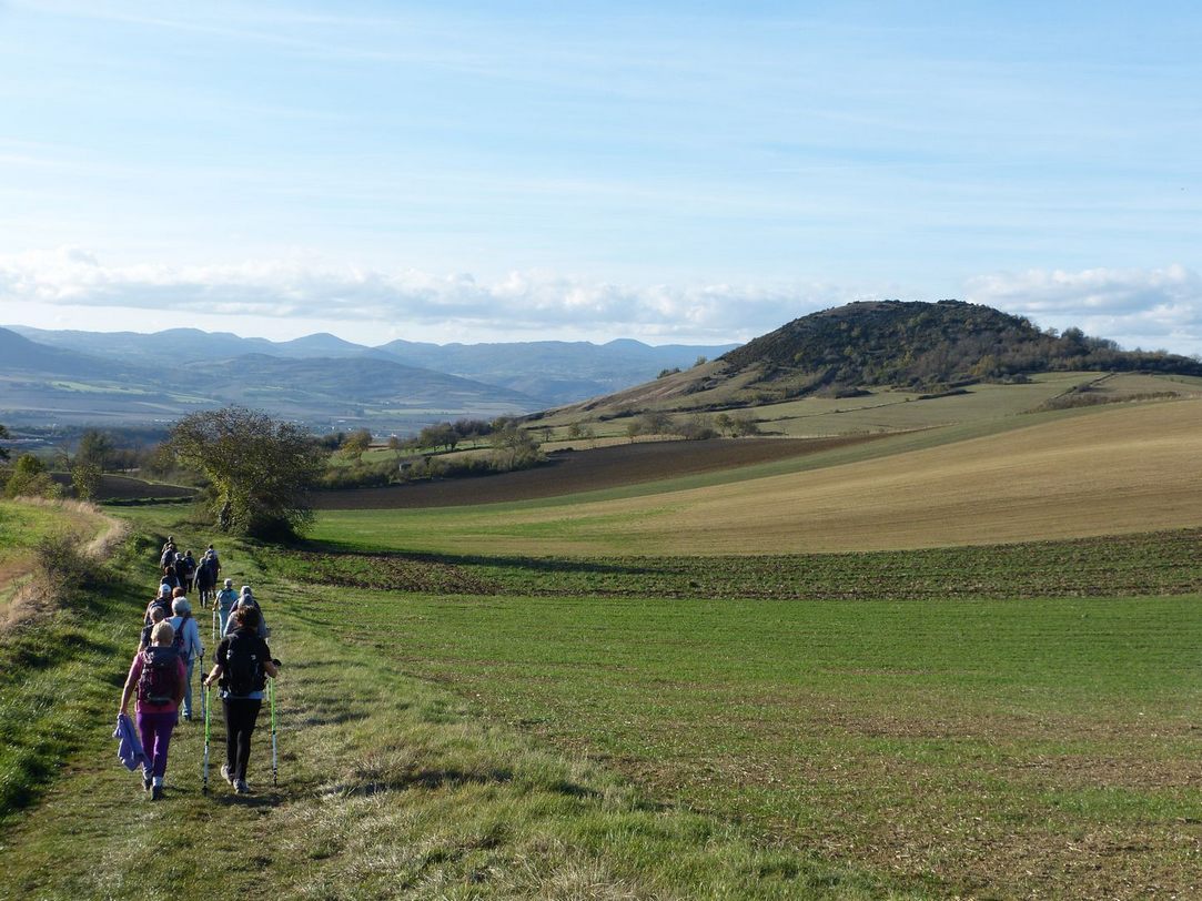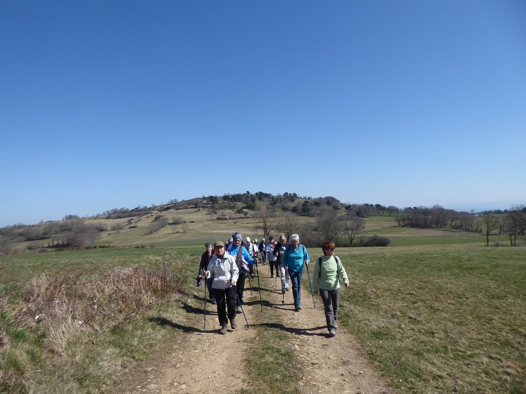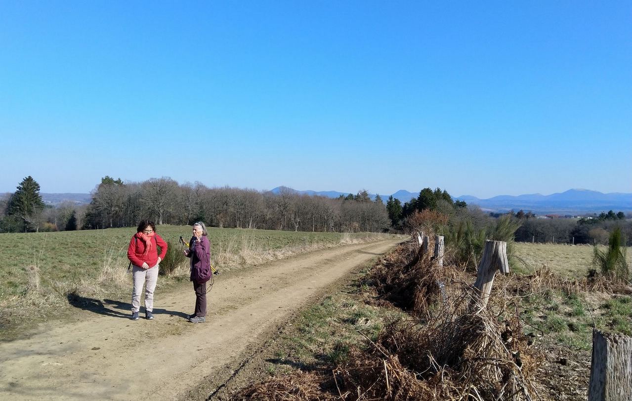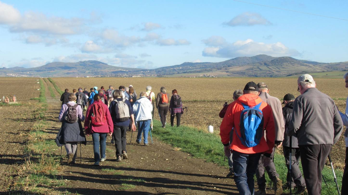 Par une température clémente, 35 marcheurs empruntent les chemins agricoles de la cuvette formée par La Sauvetat, Plauzat et le Lieu Dieu, sous le regard de la vierge de Monton. Les plateaux de Corent, de la Sarre et le puy de Saint-Sandoux nous entourent.