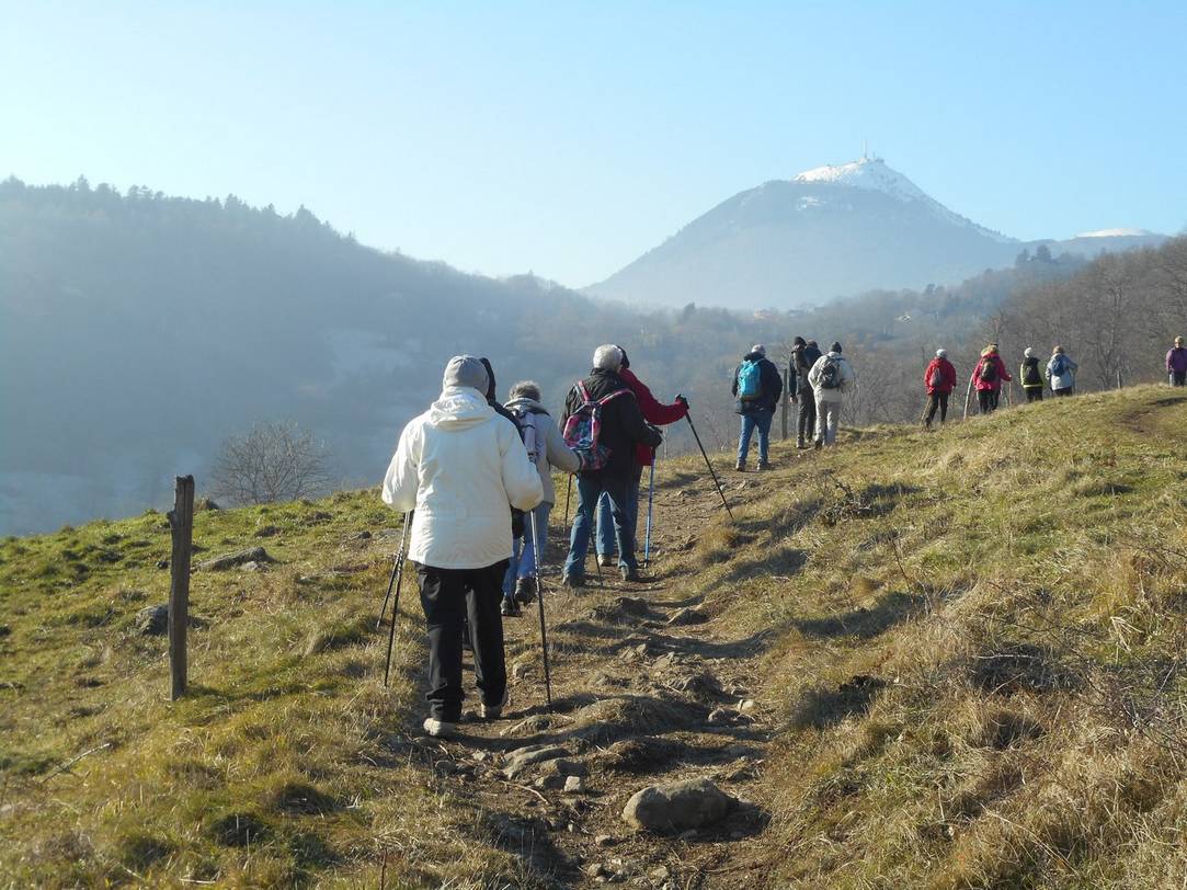 Mercredi 26 janvier : Du stade de Plauzat, nous partons vers l’Ouest puis le Sud-Ouest par un grand chemin qui monte très régulièrement dans la direction de Ludesse, qui nous est caché par une petite crête. Mais tous les villages en hauteur sont visibles, du Sud au Nord dans un grand cercle vers l’Est : Chadeleuf, Sauvagnat-Sainte-Marthe, Yronde et Buron, Montpeyroux, Corent contre son puy, Monton, la Roche Blanche sous le plateau de Gergovie, tout cela sous un ciel bleu sans aucun nuage et un soleil qui nous oblige à enlever quelques épaisseurs de pulls en plein mois de janvier ! Nous continuons vers le Sud pour emprunter le chemin qui suit la crête dominant la Couze Chambon : à notre droite, en bas, le château de Lavaur, Neschers, et plus loin, une ancienne carrière avec une cheminée de fée. À l’Ouest, le paysage est beaucoup plus accidenté et parfois une ouverture entre les crêtes qui surplombent les Couzes permet de voir le Sancy enneigé. Paysage superbe et temps idéal, il faut bien quand même revenir vers le Nord pour rejoindre Plauzat dont on voit le clocher de très loin, et l’air est plus frais au retour. Mais quelle belle randonnée, merci Claude !