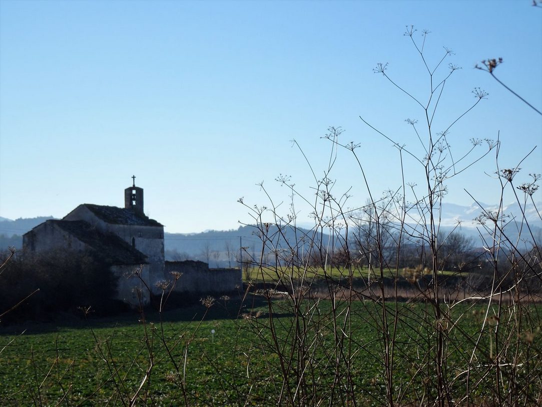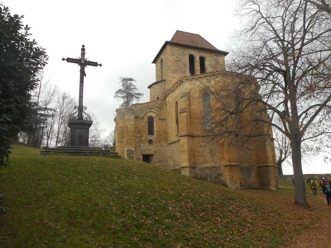 Mercredi 14 décembre : Beau lavoir et belle fontaine auprès du parking d’Erran, nous montons sur la butte de Vertaizon, vers ce qui était “le château” mais dont il ne reste que “l’ancienne église”. En effet, dès le XIII ème siècle, elle est construite sur l’esplanade du château (XII ème) : nef, abside, clocher. Mais au XVII ème, on la trouve trop haut perchée et elle est promise à la démolition. Cependant, l’abside, le chœur et la crypte sont sauvés et petit-à-petit restaurés, ce qui nous permet ce beau moment en ce lieu où le panorama à 180° est vaste sur la Limagne, ses buttes et ses lointains (Courcourt, Beauregard-l’Evêque, le Forez…). Nous redescendons vers le Nord-Ouest, traversons la Gerdouille, et tout près, ce sont le château de Chignat, toute la ville de Pont-du-château, et plus loin, Ravel dans sa forêt, Moissat… Les larges chemins de terre bien grasse tournent autour du puy Saint-Jean au milieu de grandes surfaces agricoles et nous revenons vers le Sud en face du puy de Mur. Si les courbes de niveau sont espacées sur la carte, les montées sont raisonnables mais longues, comme la redescente vers Erran et le centre du gros bourg de Vertaizon. C’est une belle balade d’hiver, toujours paysagère, et plus accidentée qu’on ne le croirait dans la plaine, merci Claude !
