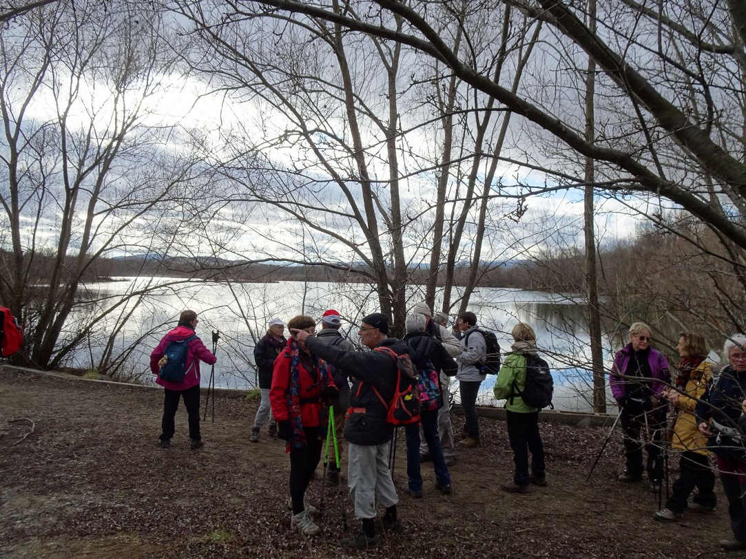Mercredi 2 février : Du grand parking à l’entrée de Pérignat-sur-Allier, nous partons vers le Nord et juste avant l’étang des Plançons, nous bifurquons vers l’Est pour rejoindre la rive droite de l’Allier. Le chemin suit la rivière en sous-bois et celui-ci est couvert de perce-neiges, en beaux tapis blancs sur le vert. L’eau de la rivière, elle aussi, a des teintes gris-vert d’océan ! Nous passons sous le pont de Cournon, nous éloignons un peu de la berge de l’Allier pour longer celle des grands étangs qui ont envahi les anciennes sablières. Au passage, nous découvrons des haies et des fruits de l’oranger des Osages, originaire d’Amérique, dont les branches sont défendues par de grosses épines. Nous suivons le chemin entre l’Allier et les étangs, (vers l’Ouest, le château de Gondole, vers l’Est la Roche Noire), où la LPO a installé des observatoires pour voir les oiseaux qui font étape en zones humides. Nous verrons des poules d’eau, des grèbes, des cormorans dont un écarte les ailes sur un tronc d’arbre pour se sécher après avoir plongé. En revenant vers Pérignat, nous contournons une sablière en pleine activité (installations imposantes et tas de gravier et de sable), et nous rejoignons le centre du village. Un grand circuit riche en découvertes très diverses par temps doux au bord de l’eau, merci Claude !