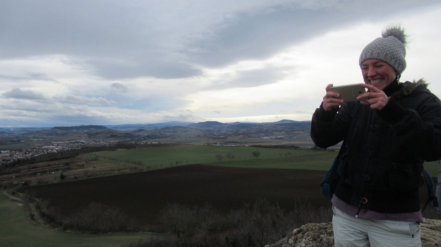 Dimanche 9 janvier : De la salle des fêtes de Montpeyroux, nous longeons une carrière d’arkose (roche sédimentaire et non volcanique) et la ferme pédagogique pour descendre doucement vers Chadieu et son château bien restauré. A notre droite, nous repérons toutes les petites villes qui dominent la vallée de l’Allier : Parent, Lachaux, Longues, Saint-Maurice-sur-Allier, Mirefleurs… et plus loin, la forteresse d’Yronde et Buron. On ne voit pas encore la rivière, mais après quelques boucles dans un taillis, elle apparaît, très haute sur berges et avec un fort débit. Nous remontons vers la ferme d’Arson et là, outre les villes de la rive droite, nous repérons Corent sur la rive gauche (souvenir de son rosé réputé…) avant de traverser de grands champs de cultures qui nous ramènent le long de l’A 75. Une croix en fer d’abord, puis une autre en pierre de Volvic (avec un écusson en forme de grappe de raisin) nous orientent vers des vignes bien taillées. De ce côté, c’est Authezat, Plauzat, et les reliefs au-dessus de la Couze Chambon : une belle randonnée paysagère par un temps frais, vivifiant, qui nous met de bonne humeur. Merci Claude !