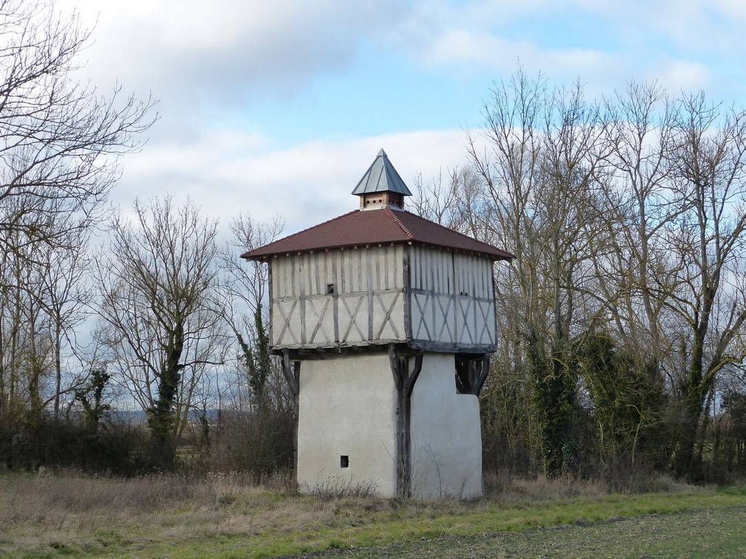 Dimanche 20 février : Départ du four de Buxerolles, petit village sur la Morge, que nous longeons un moment à côté d’un bief qui alimente un ancien moulin, après avoir vu un premier pigeonnier dans l’enclos d’une belle maison de maître : nous sommes dans la riche plaine avec sa terre noire. Au carrefour marqué d’une croix, nous allons vers le Nord jusqu’à Saint-Ignat. Il y a là des choses surprenantes : une grotte dominée par une statue de la Vierge (comme on la représente à Lourdes), un petit château d’eau où l’on accède par un escalier et où une pompe permet de remplir le lavoir (tout le Nord de Saint-Ignat est occupé par des marais), un ancien couvent, deux pales d’hélice d’avion mystérieusement mises en valeur, et de nombreuses maisons en pisé… Nous allons vers Tirande, et repérons les bourgs alentour : Surat, Pagnant, Maringues, mais aussi vers le Nord-Ouest la butte de Notre Dame des Moissons près de Montbacon, et plus loin, les Bois Noirs et le Forez. De l’autre côté, la chaîne des Dômes est dans les nuages mais tout le paysage est dégagé autour de nous, grâce sans doute au vent frais qui nous accompagne. À Tirande, puis près de Buxerolles, nous admirons encore deux pigeonniers (avec pigeons !) bien restaurés. Une belle randonnée vivifiante et sans difficulté, merci Claude !