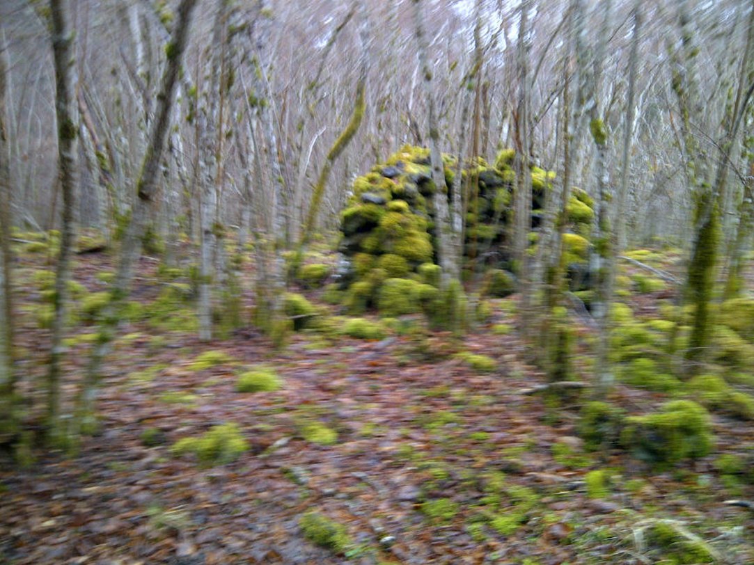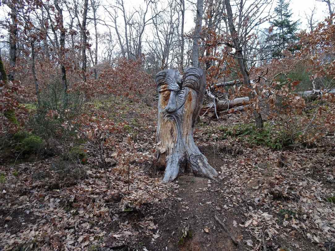 Dimanche 20 mars : Nous nous retrouvons au Petit Chambois, dans cette clairière entre les Dômes et la vallée de la Sioule. Une sculpture de M. Montel rend hommage aux artisans de la pierre volcanique quand nous partons vers le Nord-Est par un chemin à découvert : derrière nous, le Sancy et la Banne d’Ordanche, et tout près à notre droite, le puy de Dôme et le puy de Côme. Bientôt, nous entrons dans la forêt dense de la cheire de Côme, d’abord par un petit chemin qui serpente au milieu de ce paysage extraordinaire de chaos basaltique. Les blocs recouverts de mousse d’un vert lumineux sont partout entre les arbres, entassés en tous sens en monticules impressionnants : la cheire de Côme est une coulée “aa”. Nous traversons une route avant de rejoindre un grand chemin cette fois, qui traverse la cheire (même paysage étonnant, fascinant) et conduit à la “pierre signée”. C’est une pierre plate, dont la forme rappelle une peau d’animal, et qui est gravée de signes que l’on sait très anciens mais que l’on n’a pas déchiffrés : des triangles, des flèches, des croix dont l’une est en relief. Nous passons près de quelques trous de glace dont Martine nous explique la formation. À l’orée du bois, nous faisons un petit détour par une carrière de basalte et nous regardons autrement le puy de Côme qui a vomi tous les blocs que l’on vient d’admirer. Nous revenons par le Grand Chambois, encore impressionnés par ce lieu fragile, à préserver, mais sûrement un peu magique, merci Claude !