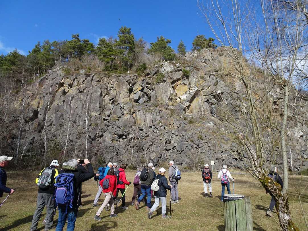 Mercredi 9 mars : Avant Sauterre, un chemin conduit au parking de “la roche de Sauterre”, site géologique remarquable dans ce coin des Combrailles. Après être passés devant l’entrée conservée d’une mine sur laquelle a été construit un gîte récent (quelques autres sont de l’autre côté du chemin), nous arrivons au pied de la fameuse roche dont Martine nous explique le caractère exceptionnel : haute paroi basaltique sur laquelle on voit des traces d’olivine, ce fut aussi une carrière exploitée. Nous prenons le sentier botanique qui monte sur la roche, où une table d’orientation nous situe tous les lieux du paysage que nous apprécions toujours : les Combrailles, les Dômes, le Sancy à l’horizon… Nous repartons dans le bois vers les James, où poules et canards sont en liberté (l’un d’eux perché sur la fontaine), puis nous revenons vers l’Est par le bois de Serval pour gagner Laty, autre hameau qui paraît isolé dans cette partie Nord du parc des Volcans où prennent leur source l’Ambène et la Morge. Nous revenons vers le Sud pour retrouver Sauterre, le village d’abord puis le parking au pied de la roche. C’est un agréable parcours, aisé mais avec beau point de vue, merci Claude !