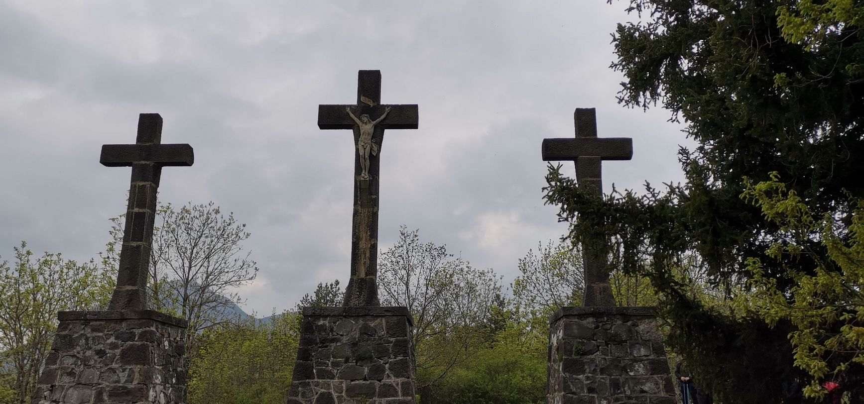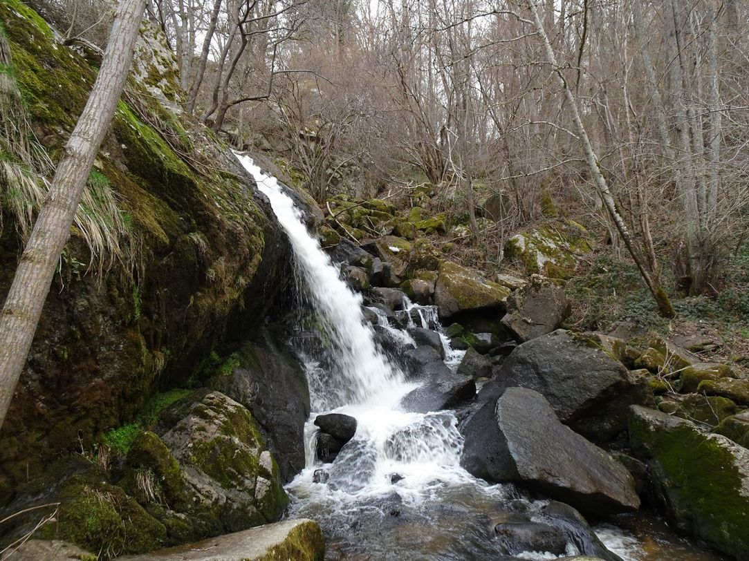 Mercredi 16 mars : Le premier rendez-vous est sur le parking de la cascade de Say, après la Miouze, nous descendons par un chemin bien aménagé dans les gorges du ruisseau de Gelles, qui tombe en une cascade abondante puis trouve son chemin entre un chaos de blocs de granit. C’est un endroit à la fois sauvage et accessible. Nous remontons et reprenons la route pour nous garer cette fois au pied d’une falaise, nous traversons le ruisseau et prenons la direction du Sud sur une petite route qui monte à Magnol. En face de nous, toute la chaîne des Dômes se dessine dans un voile : c’est la poussière de sable qui nous vient du Sahara ! A Magnol, quelques maisons anciennes sont bien restaurées mais l’ancien four banal est en piteux état. Petit crochet vers l’Est et encore le Sud, et nous atteignons Rochette, autre hameau aux vieilles maisons, d’où nous repartons vers le Nord par un large chemin au pied du puy de Banson, puis par une petite route qui nous conduit au calvaire de Gelles : trois croix, comme il se doit, mais si celle du celle du Christ est traditionnelle, les deux larrons sur leurs croix respectives ne sont pas cloués mais liés par des cordes. Le calvaire domine la ville, nous descendons vers elle sans aller au centre du bourg car un chemin nous ramène vers l’Est. Il suit la rive droite du ruisseau, passe à Labbas et retrouve la route de Magnol tout près de nos voitures. La cascade de Say est très belle et ce pays de Gelles, entre Dômes, Combrailles et Sancy, est bien agréable, merci Claude !