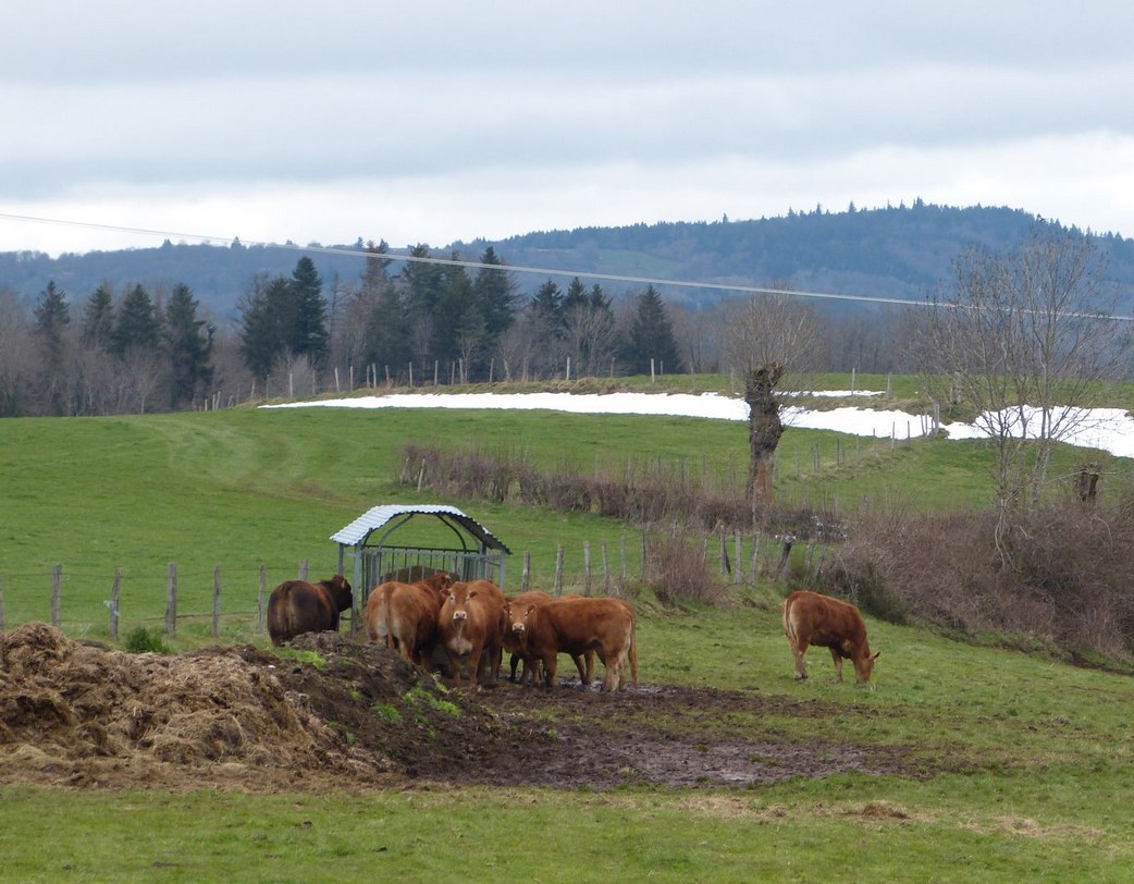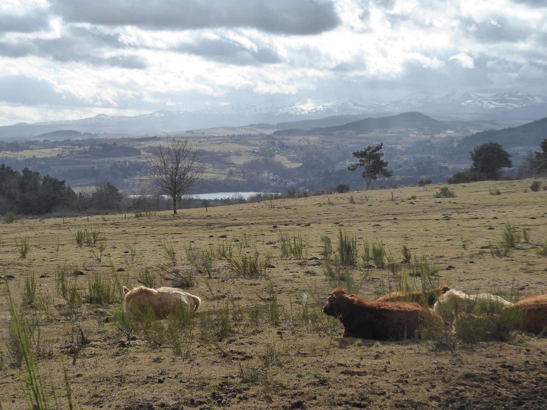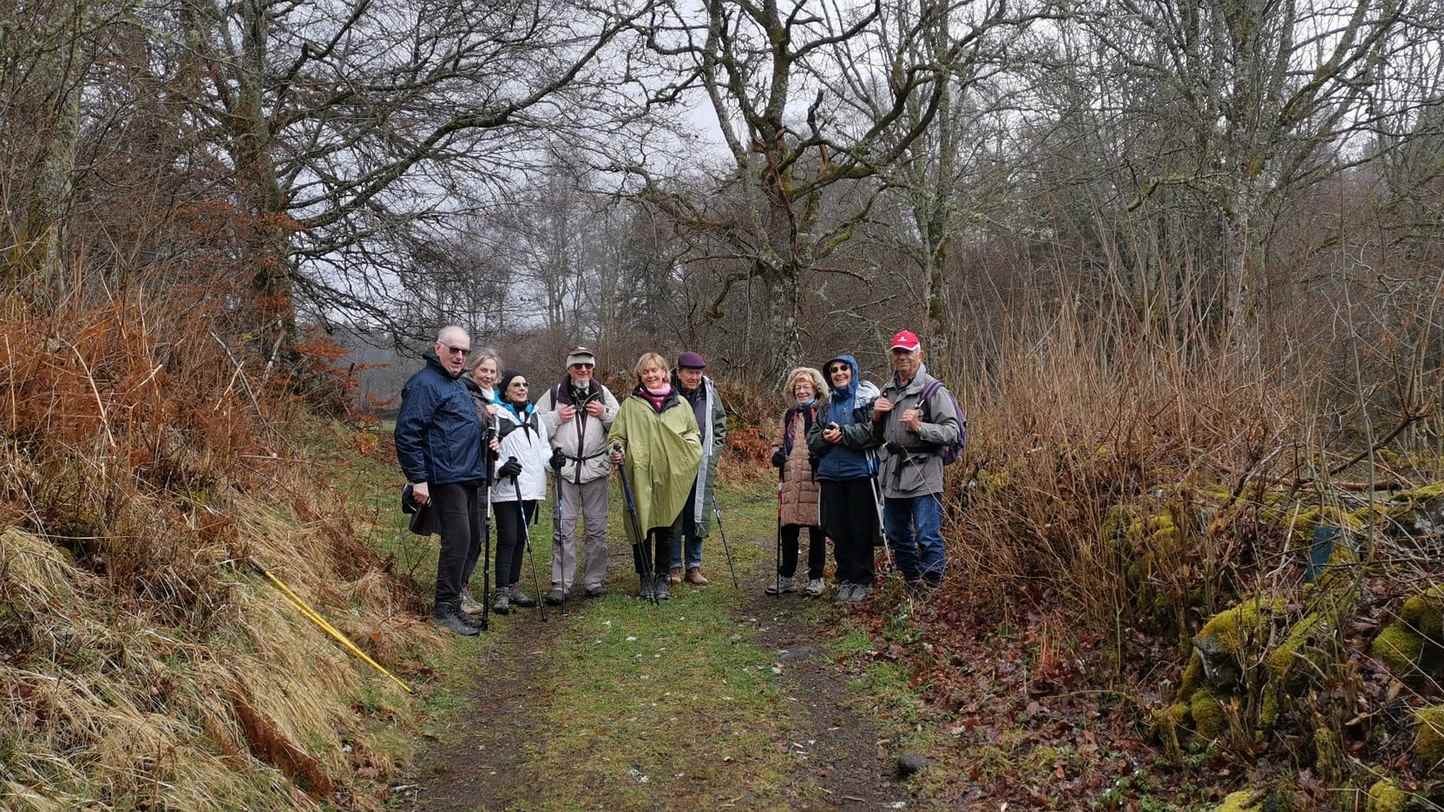 Jeudi 24 février : Partis tout en bas de Nadaillat, il nous faut monter dans le village pentu où les rues sont étroites, mais nous en sortons bientôt pour nous diriger vers l’Ouest. Sur notre droite, dans la montée régulière de la Vigeral, le Puy de Dôme, et quand on entre dans le bois, c’est une belle descente qui nous conduit juste au-dessus du lac de la Cassière, peu visible entre les arbres. Nous repartons vers l’Est : petite montée encore dans le bois, avec de belles échappées du paysage côté Sud : le lac d’Aydat, tout proche, à l’horizon le Sancy encore enneigé et même les sommets du Cantal. Il y a déjà vaches et chevaux dans quelques prés et la descente est douce. Nous traversons la route de Rouillat et pour revenir à Nadaillat, nous suivons un beau chemin bordé de pierres moussues, un peu boueux à l’arrivée. Une bien jolie balade où les petites grimpettes nous font oublier que le vent est frais hors du bois ! Merci Guy !