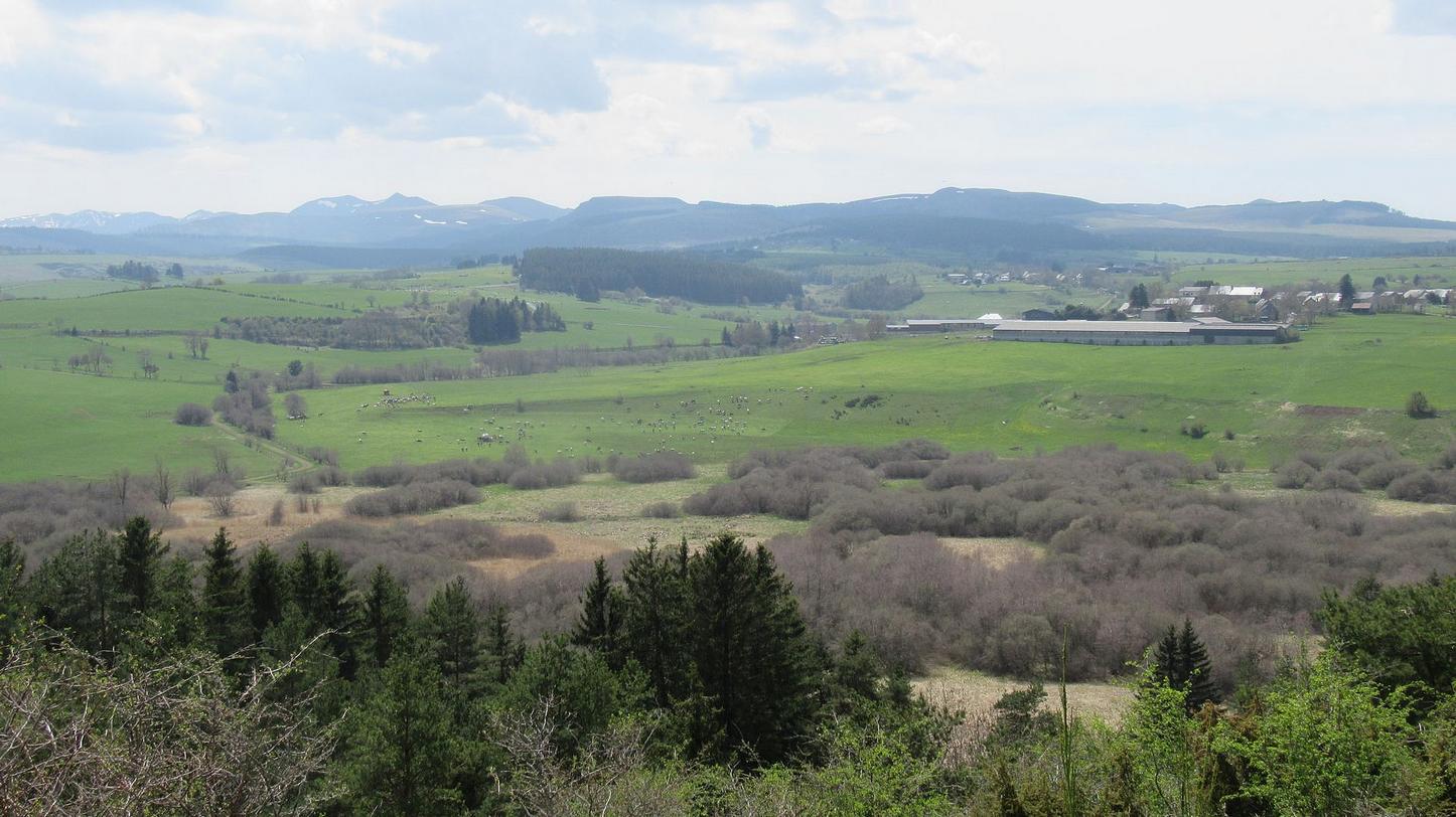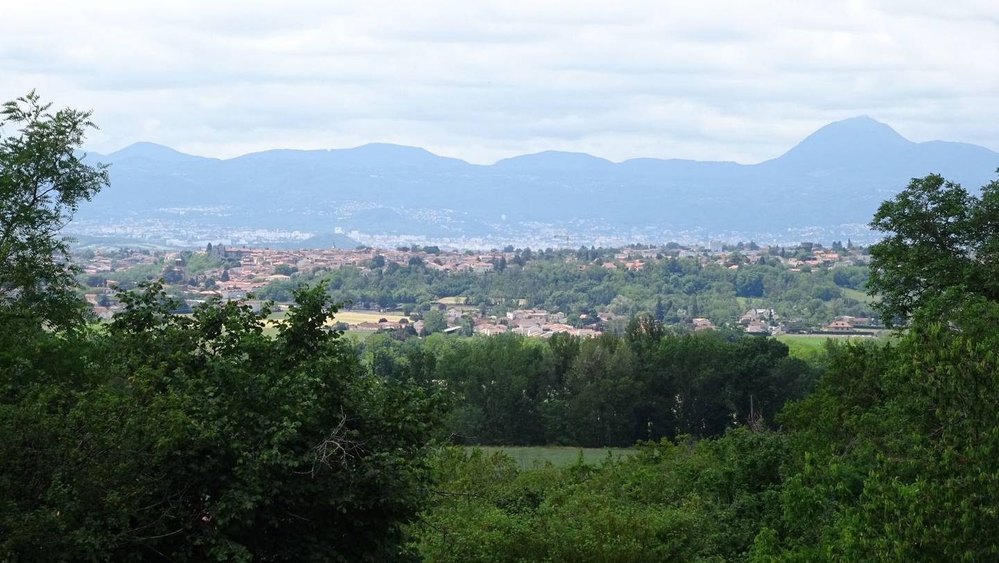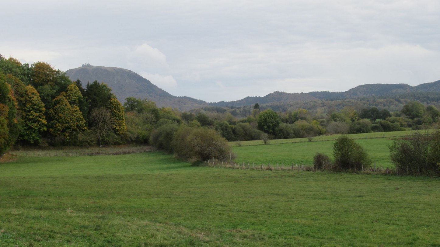 À la sortie du bois, nous découvrons une belle vue sur une partie de la chaîne des Puys ; on distingue les Puys Chopine, Jume, Coquille etc.