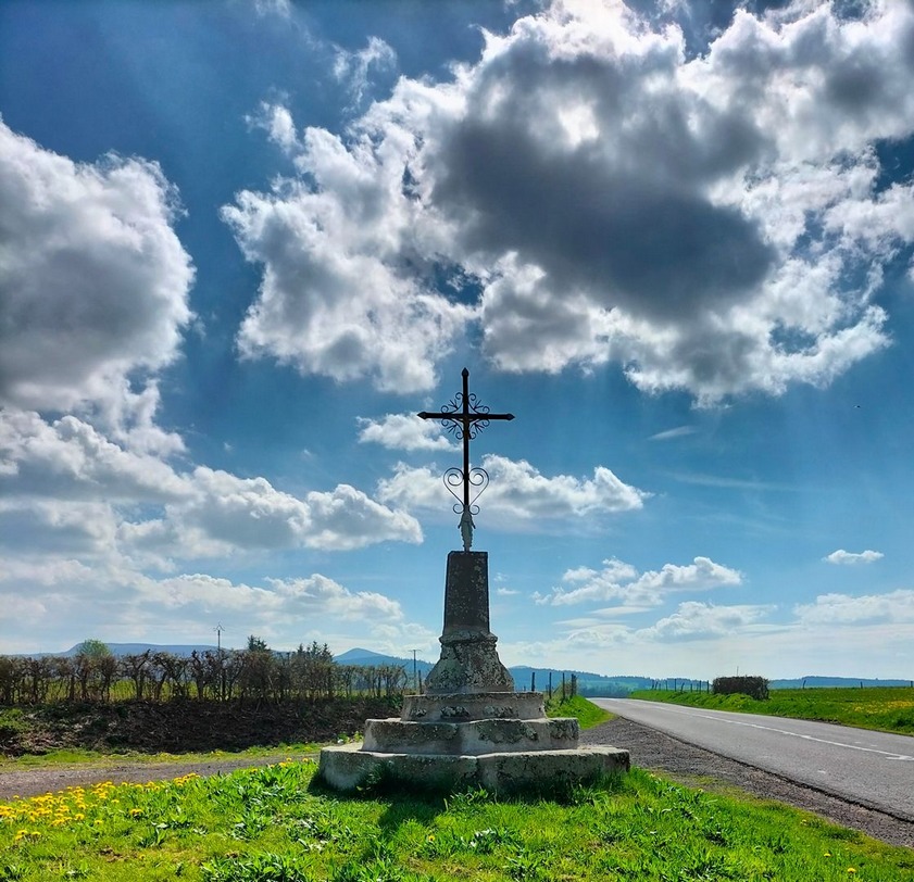 Jeudi 24 mars : Au-dessus du ruisseau de Saint-Genès, nous prenons la route de Thèdes pour bifurquer rapidement sur un grand chemin qui mène à Chatrat et nous empruntons quelques rues au centre du hameau. Mais c’est à nouveau un large chemin qui conduit à Laschamps vers l’Ouest au pied du puy de Chatrat, très boisé. À notre gauche, le bois est dense, mais à droite, c’est Manson et toute la plaine de Laschamps dominée par le Puy de Dôme tout proche. Avant la cime de la côte, nous longeons à nouveau le bois en revenant vers l’Est, mais cette fois, outre les puys au Sud du Géant, nous avons le Sancy au loin, et nous descendons à Beaune le Chaud par un chemin caillouteux qui arrive directement sur l’église. Nous faisons une petite étape, qui dans l’église, qui devant la croix sur son parvis qui domine le village et le paysage. Nous remontons doucement jusqu’à la croix de Beaune (ancien menhir christianisé ?) pour redescendre par un joli chemin à Chatrat, puis à Saint-Genès Champanelle. Ce trajet nous séduit toujours à deux pas de chez nous et par très beau temps, merci Guy !