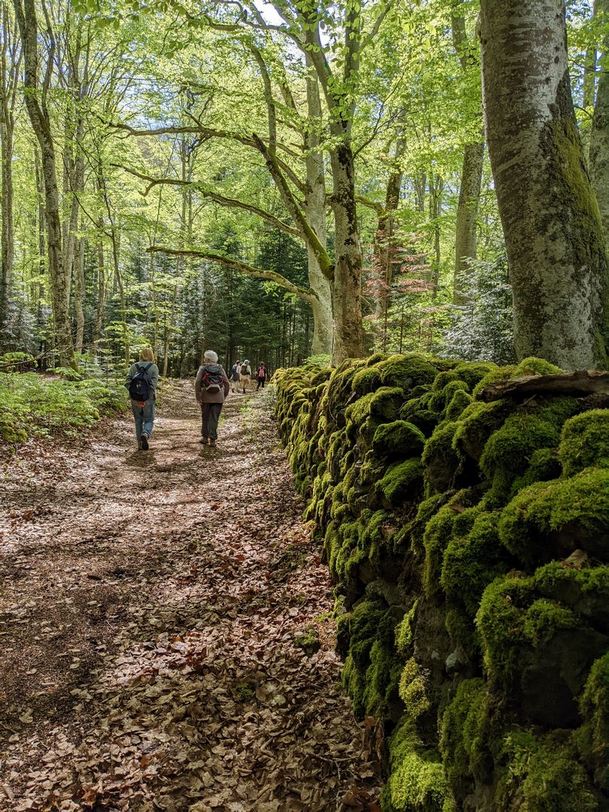Jeudi 31 mars : Le temps est nuageux, nous sommes un petit groupe de courageux qui part en direction du col des Goules. Le col passé, c’est une petite brume qui voile un peu les Dômes, et elle est encore là au hameau des Roches, avec son grand lavoir-abreuvoir, ses “travails” et son four banal. Très vite, nous entrons dans la forêt de la cheire de Côme par un petit chemin plein de racines d’arbres, qui serpente, monte et descend dans un paysage que la brume légère rend féérique. La cheire de type « aa », c’est-à-dire formée de blocs basaltiques enchevêtrés dans la forêt, offre toutes les couleurs : les rochers sont couverts de mousse verte, lumineuse, les feuilles des chênes, hêtres, bouleaux, au sol sont restées ocre, mais il y a déjà des bourgeons vert tendre et quelques arbres en fleurs, les résineux sont vert sombre, le lichen est blanc sur les troncs, il y a quelques fleurs de printemps et plus nous avançons, plus le soleil pointe son nez !