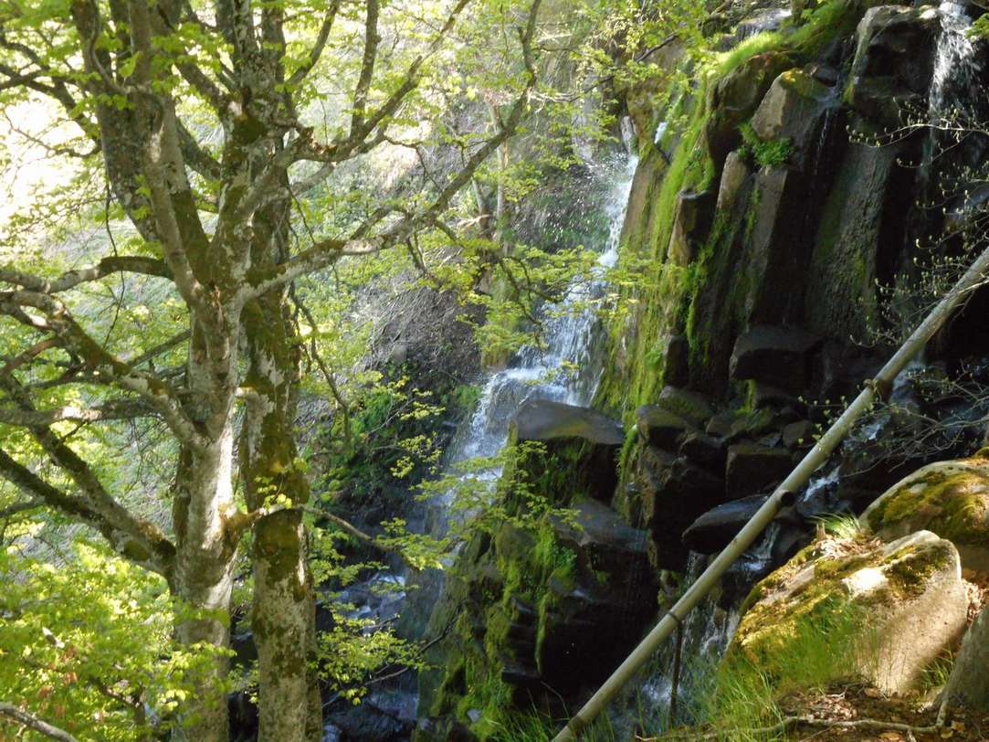 Mercredi 20 avril : Il pleuvine, et nous sommes pourtant nombreux au stade de Nébouzat ! Nous passons sous la 89 avant de la longer un moment puis de traverser le ruisseau de la Gorce et nous arrivons à la cascade des Saliens. Elle tombe en deux chutes importantes, que l’on voit d’abord par au-dessus puis en-dessous, et on la verra à nouveau dans le petit chemin fleuri qui conduit aux Quatre routes. On la suit encore vers Pont-des-Eaux, où la fontaine a tari après les travaux sur la route nationale. En remontant vers Monteribeyre, c’est la Sioule qui coule en contre-bas et là encore, deux sources sont asséchées. L’eau est partout dans cette plaine au pied des Dômes, Dômes que l’on voit dès qu’on sort des rives boisées. Après être passés près de la source Fontane, c’est le grand plateau au-dessus du Guéry et le puy de l’Ouire qui sont au loin. La pluie a cessé depuis longtemps, les chemins entre Antérioux et Nébouzat sont bien secs et la boucle est fort agréable, merci Claude !