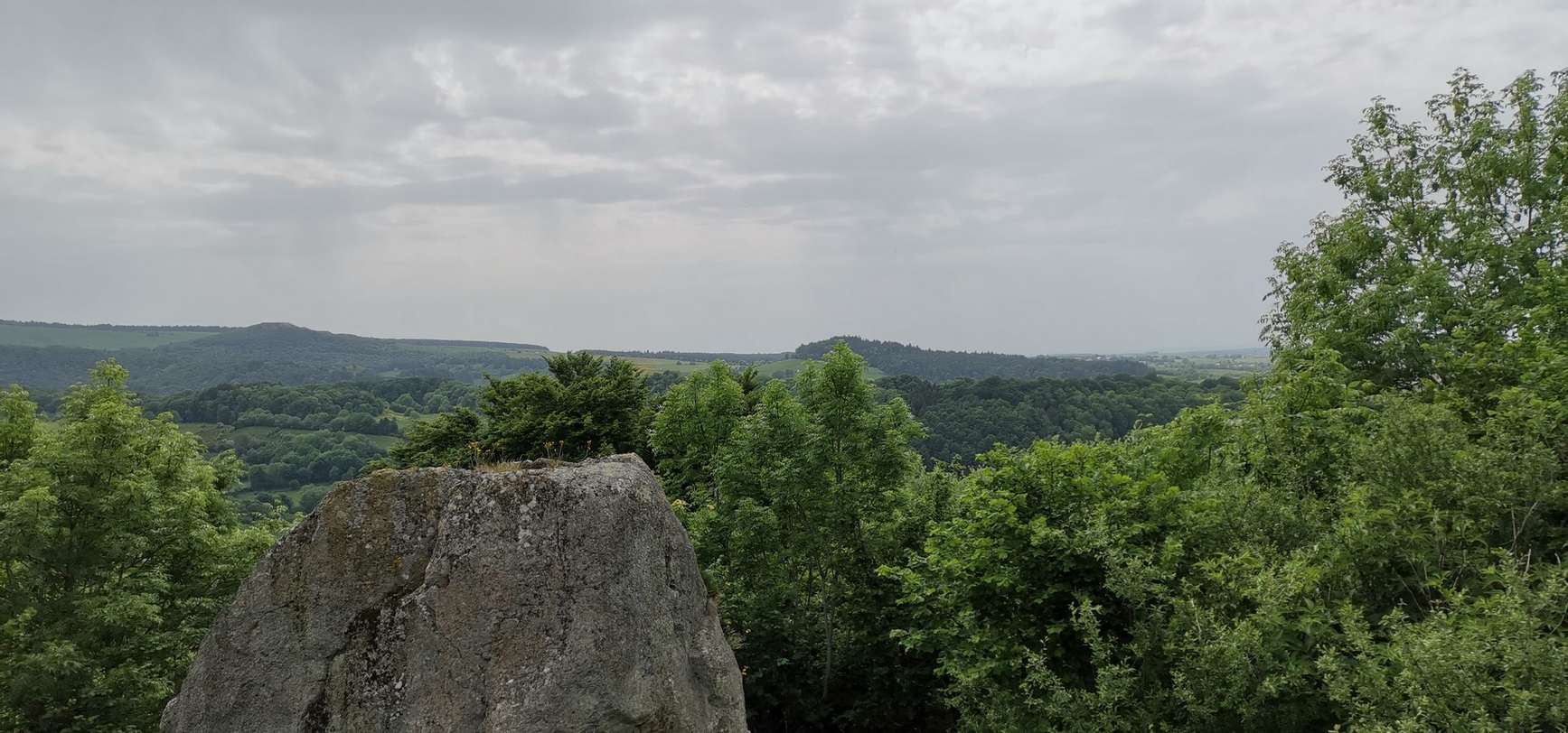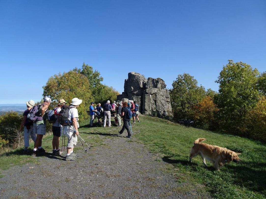 Mercredi 21 septembre : Le Mas est un petit hameau plus haut que Fohet. La route s’y arrête, nous descendons par un chemin caillouteux vers Cournols et remontons, toujours vers l’Est : paysage immense, magnifique, au loin tout le Livradois-Forez et en deçà les multiples collines sous lesquelles s’abritent quelques villes et villages. Nous faisons vers le Nord une boucle autour de la Pierre Blanche, petite butte dans cette campagne accidentée où le granit affleure partout, dans le chemin ou dans les près. Nous reprenons la direction de l’Est, toujours à découvert, puis revenons vers l’Ouest en dessous de Cournols et au-dessus des gorges de la Monne. Le chemin est barré par un troupeau : nous grimpons par un sentier puis à travers champs pour atteindre le grand dolmen, impressionnant, majestueux. En remontant vers le Nord, dans ce paysage toujours aussi varié, on aperçoit le gros rocher des trois moines. Le retour au Mas se fait dans le bois. C’est un circuit où la vue est toujours lointaine, diverse, magnifiée encore par un beau soleil, merci Claude !