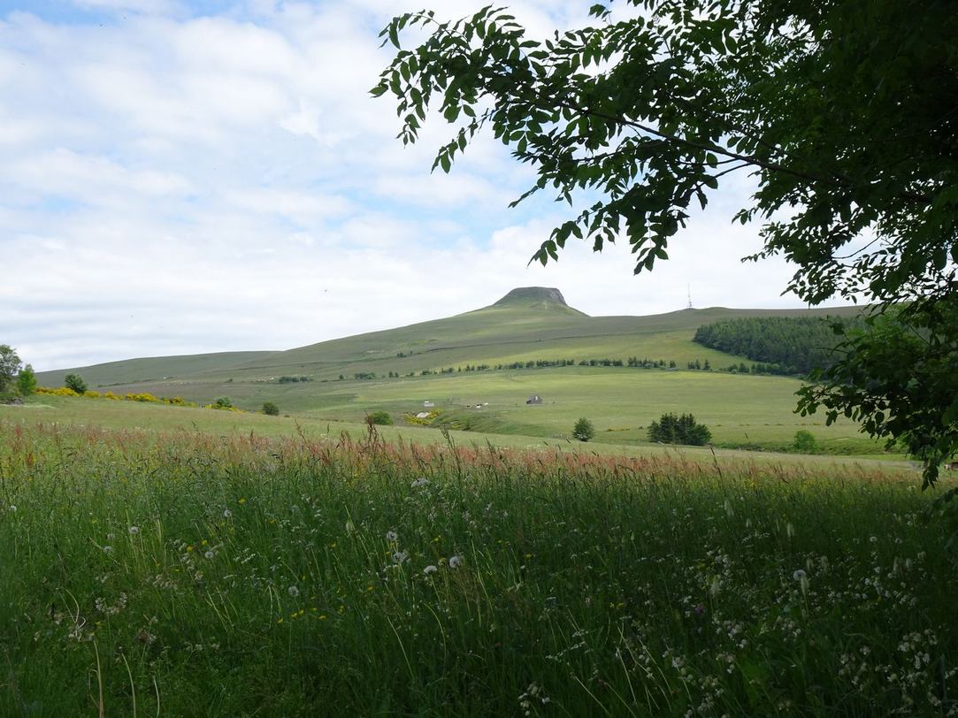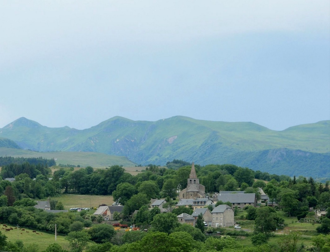 Jeudi 9 juin : Nous sommes tous rapidement sur la grande place d’Aurières, au centre de cette plaine entre Dômes et Sancy. Nous partons vers l’Est : la Sagne, les Grands Prés Courts, et juste avant les Petits Prés Courts, nous revenons vers l’Ouest et le Nord. Les puys au Sud du Puy de Dôme sont très verts, clairs quand ils sont dégagés, sombres quand ils sont boisés, et les prés que nous longeons ont beaucoup d’herbe et de fleurs. Les orages des derniers jours ont rendu la végétation luxuriante. En revenant encore à l’Ouest (au loin, la pointe du roc de Cluzeau), nous traversons la Gigeole qui prend naissance dans un petit étang près du Couhalion et qui traverse Aurières. Nous rejoignons le village, toujours par de grands chemins, le monument aux morts est près de l’église et beaucoup de maisons en pierre sont belles. Aucune côte, vent frais vivifiant, jolie promenade, merci Claude !