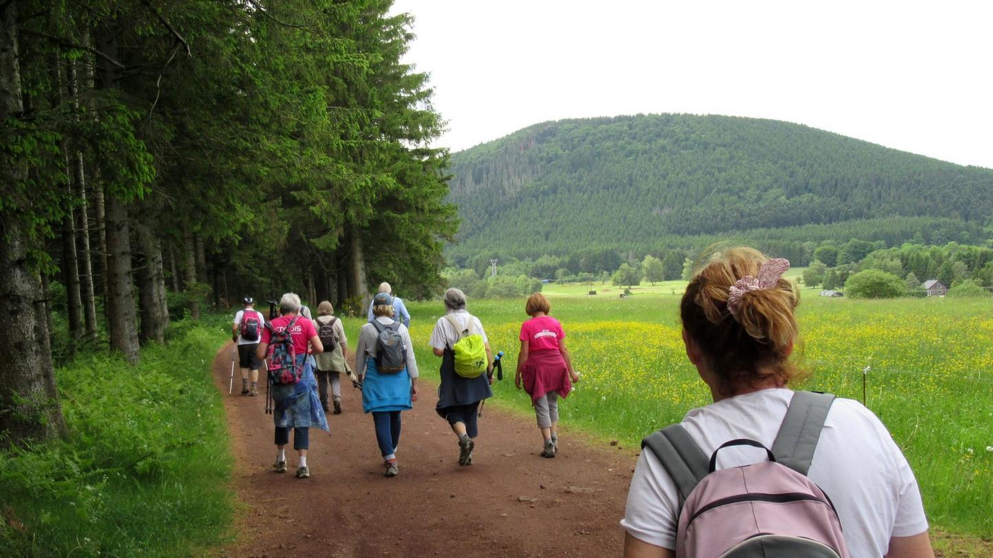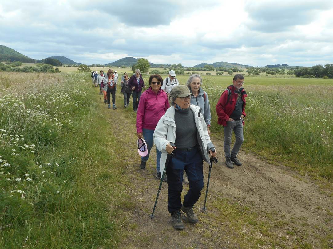 Jeudi 5 mai : Après les orages de la veille, le temps paraît encore incertain mais nous sommes une vingtaine de courageux tout au bout du village de Mareuge. Nous traversons ce village qui nous étonne : malgré son isolement, des artisans affichent leurs productions, la chapelle, encadrée d’une maison, est bien restaurée, comme le four à pain et les fontaines fleuries. Il y a même un habitant passionné qui se consacre à la construction d’un petit château fort… en parpaings, certes un peu incongru ici ! En allant vers l’Est, (de belles orchis mauves et blanches au bord du chemin) nous traversons les deux départementales avant de revenir vers le Nord en direction de Zanières, au milieu des prés de la vallée de la Monne. Les nuages restés bien gris nous donnent quelques gouttes de pluie et même, pendant quelques secondes, des petits grêlons mais le temps se calme vite et à Zanières, nous bifurquons vers l’Ouest pour longer le puy de Monténard, très boisé. De ce côté, ce sont Saulzet-le-Froid et son étang, la Martre, Pessade que l’on situe avant de revenir vers le Sud à Mareuge, avec en face de nous le Sancy qui a encore quelques plaques de neige. C’est une boucle sans difficulté, paysagère, par temps vivifiant, merci Georges !