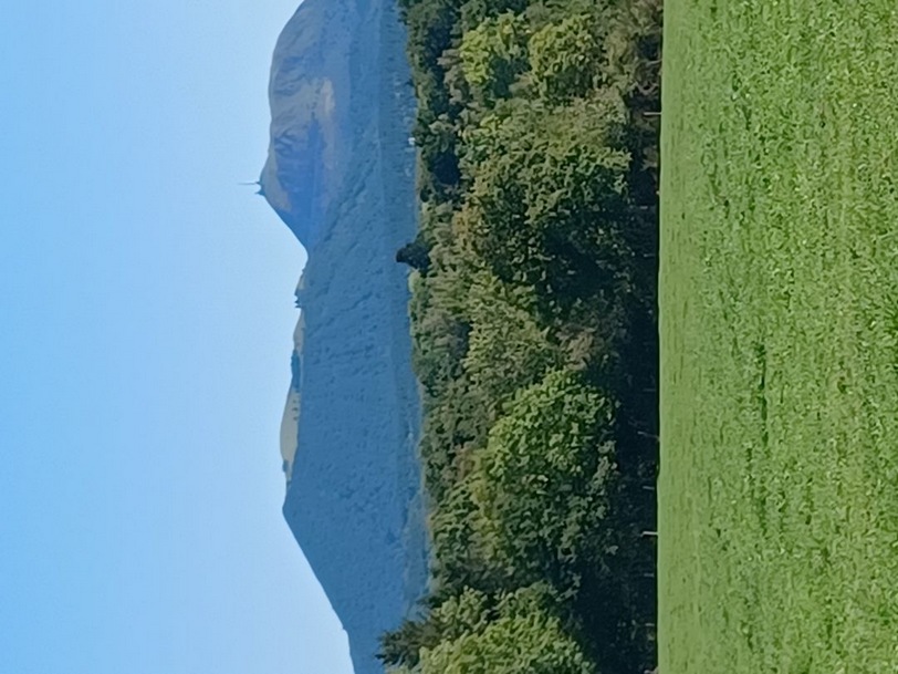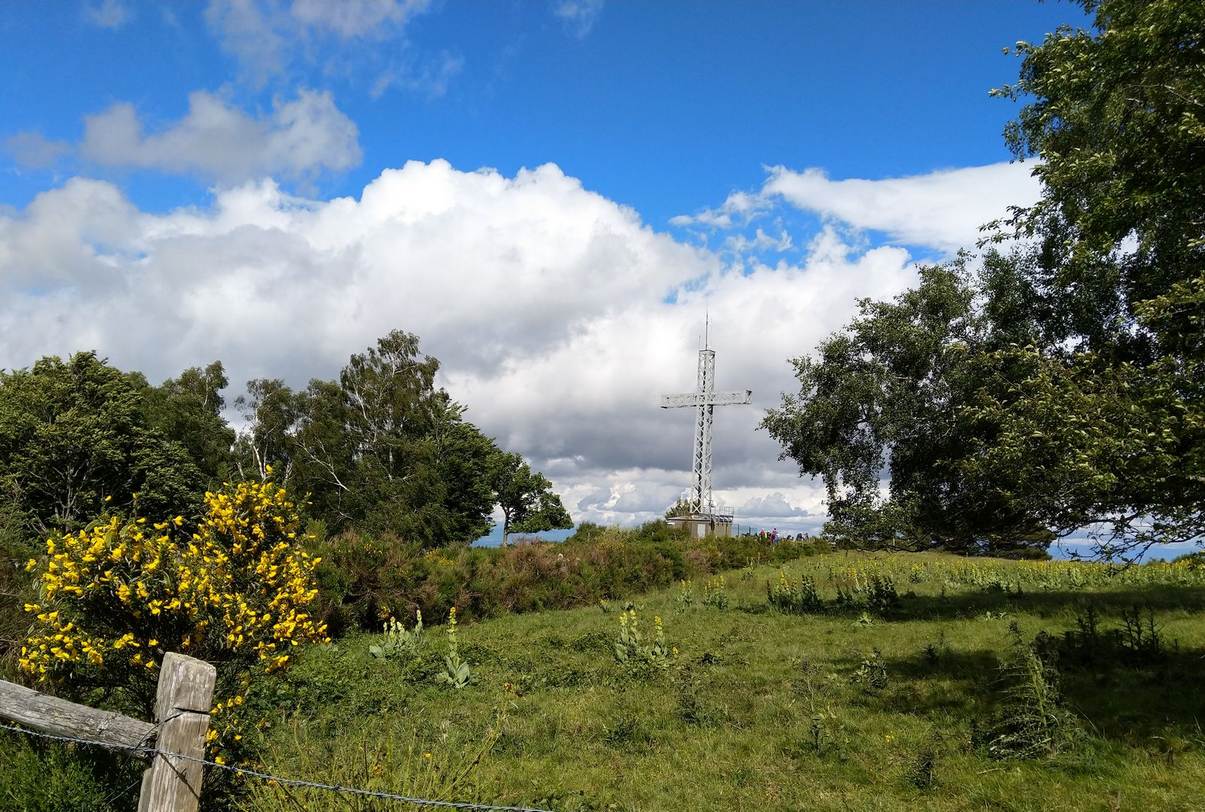 Mercredi 8 juin : À l’entrée de la Fontaine-du-Berger, nous prenons le grand chemin puis les petites sentes qui passent en sous-bois au pied du Pariou. Les chemins ont changé, parfois interdits par des barrières, on en trouve d’autres mais il reste des vestiges d’une ancienne carrière de pierre et nous revenons vers le Nord et traversons la route. Nous sommes bientôt au pied des puys des Goules et du Grand Sarcoui, tantôt en forêt, tantôt à découvert. On a alors de belles vues sur les puys tout proches, le puy de Dôme “a le chapeau”, mais une autre ouverture sur l’Est nous montre tout Clermont et le Forez au loin. Nous arrivons à Ternant, nous montons sur la butte de l’église (une mosaïque représente le sacrifice d’un mouton… ?) puis en pente régulière vers la croix de Ternant. Nous avons rencontré d’abord un groupe de jeunes marcheurs, puis des jeunes gens sur de drôles d’engins électrifiés. Nous retrouvons ces derniers au pied de la croix métallique d’où la vue est magnifique. Les nuages sont de plus en plus menaçants mais le retour au parking est rapide en descente et la pluie sera pour plus tard. C’est un beau circuit sur “nos” puys, merci Claude !