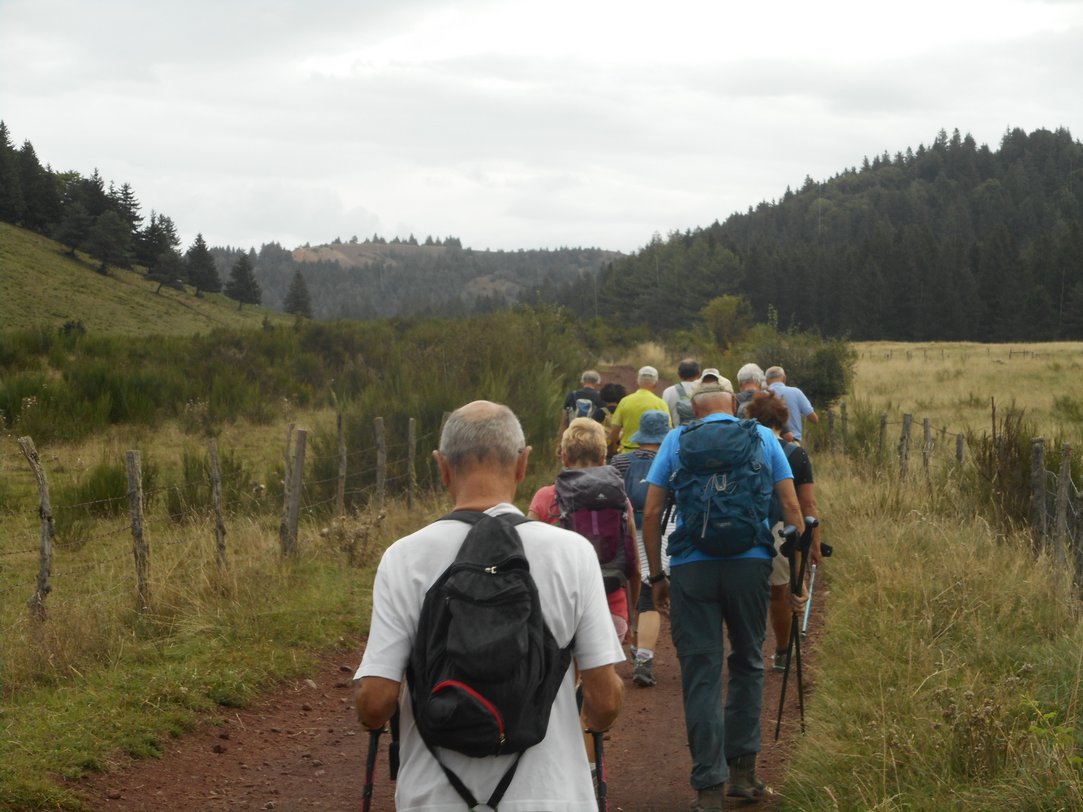 Le pique-nique près du lac est bucolique, et nous partons vers le Nord : le paysage est immense, à l’Ouest toute la chaîne des puys à l’horizon, plus au Sud le Sancy, le Cantal… Nous revenons vers le Mas, nous sommes dans les lieux arpentés par la Reine Margot : château du Chéry, de la Reinery. C’est en revenant au-dessus du Vernet, avant le camping qui domine le village et fait face au château de Monfort que nous prenons une belle averse, mais la descente est rapide vers le lac et la pluie ne nous aura privés que de monter jusqu’au château. Mais toute la journée fut riche et agréable, fort bien organisée : merci Georges !