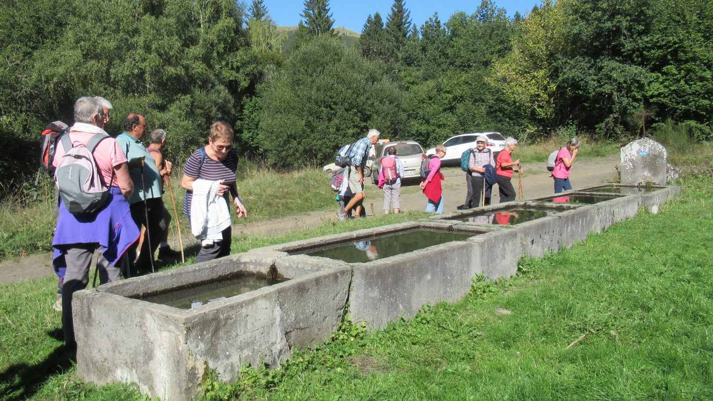 Jeudi 22 septembre : entre Montmeyre et Ceyssat, regroupement dans un pré à l’Ouest des grands Dômes. Nous prenons une grande piste à découvert, le Puy de Dôme est en face de nous, le panoramique est en montée et les ailes volantes sont nombreuses dans le ciel tout bleu. A l’orée du bois au pied du Petit Sault, une stèle dans un grand carré de graviers commémore les événements qui se sont déroulés ici pendant la guerre avec le Maquis des Ardents dont les clermontois connaissent l’histoire. Un peu plus loin, le bac de Montmeyre est un long abreuvoir presque enterré dont les bassins se déversent les uns dans les autres. En effet, il y a peu d’eau au pied du Puy de Dôme et il a fallu capter les moindres sources. En entrant dans le bois vers le Nord, nous trouvons le bac de Ceyssat : même belle pierre pour plusieurs bassins surélevés cette fois, surmontés d’une croix en fer et dont la source est captée quelques mètres plus loin. Des chasseurs sont là aussi mais eux sont arrivés en voiture… Nous redescendons vers Montmeyre à l’ombre de la forêt puis par une grande piste au soleil : une bien jolie balade au pied des volcans, avec au retour la Banne d’Ordanche et le puy de l’Ouire à l’horizon, merci Jean-François et Jean-Gabriel !
