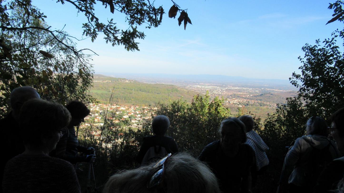 Jeudi 27 octobre : Le parking du complexe sportif de Blanzat est sur la rive droite du Bedat : nous traversons la rivière encore bien modeste pour grimper dans la ville, puis sur un chemin qui monte doucement sur le plateau de la Bade. Quelques courageux s’aventurent dans une grotte basse et noire, mais c’est un passage qui rejoint le chemin qui, lui, conduit à une large piste que nous suivons en direction des Mauvaises. Le Puy de Dôme est toujours en fond d’horizon, et au carrefour des Quatre Vents, nous redescendons dans un sous-bois assez clairsemé pour laisser souvent de belles vues sur la Limagne vers l’Est avec au premier plan un paysage urbain, voire industriel (la zone de Ladoux par exemple). Après un chemin caillouteux, un autre belvédère montre au Sud la vallée du Bedat et les côtes de Clermont. En revenant dans la ville, nous passons à côté de la salle de spectacle de la Muscade et retraversons le centre jusqu’au parking. C’est une boucle agréable, diversifiée avec d’étonnants paysages parce qu’on n’imagine pas le Nord de Clermont aussi accidenté. Jolie découverte, merci Bernard !