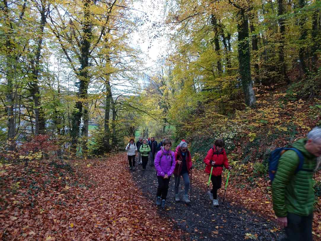 Jeudi 3 novembre : 21 marcheurs également, mais un ciel plus changeant. Départ du parking de Covoiturage sous Le Crest. Le chemin suit un moment l’A75, puis s’engage dans la vallée verdoyante de l’Auzon, ouvrant de beaux points de vue sur la Roche Blanche, la falaise qui la domine et ses grottes troglodytes. Nous remontons le cours de l’Auzon aux berges boisées, croisons des chemins aux noms évocateurs des anciens moulins, traversons une première fois la rivière, arrivons au bas de La Roche Blanche (belle croix datée de 1717), descendons dans la vallée et retraversons l’Auzon. Le parcours est maintenant en sous-bois : des éclaircies de nouveau sur La Roche Blanche, mais maintenant, c’est la Vierge de Monton et la tour du Crest qui attirent les regards et guident nos pas. Arrivés au Crest, nous ne monterons pas à sa tour, mais redescendrons rapidement par le chemin des Foisses pour rejoindre les voitures. Jolie balade bucolique près de zones urbaines, merci Georges !