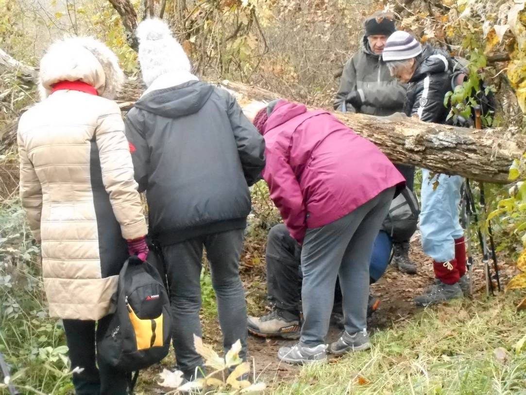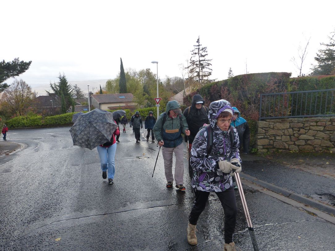 Mercredi 23 novembre : L’après-midi devait avoir un temps clément… Du parking de l’ancien practice du golf, nous grimpons entre les maisons de Gravenoire jusqu’à la route de Charade. Mais la pluie est de plus en plus persistante, le vent retourne les parapluies, et au point haut, la décision de sagesse s’impose : de la croix de Frun nous redescendons au parking, nous pourrons nous sécher avant de se retrouver aux Jardins de Saulzet pour goûter le Beaujolais nouveau ! Le petit groupe de courageux (téméraires ?) qui a essayé de braver la pluie est rejoint par tous ceux qui voulaient goûter le vin, grignoter, mais surtout se retrouver, discuter, prendre des nouvelles de chacun. Ambiance fort joyeuse ! Merci Claude pour notre heure de marche, et le bureau pour l’organisation de la rencontre !