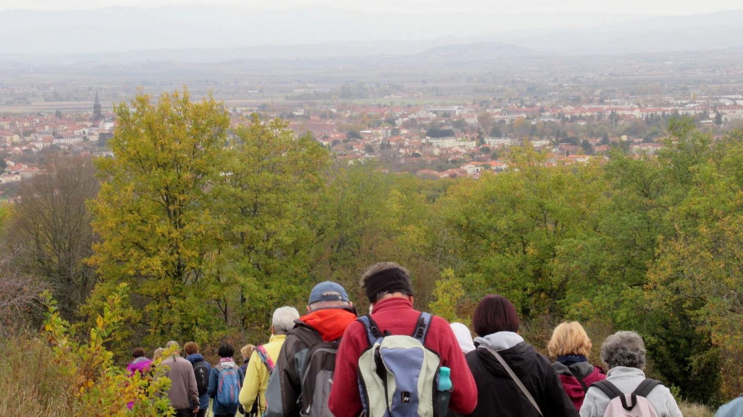 Jeudi 24 novembre : La pluie et le vent de la veille ont cessé, il ne reste plus qu’un ciel couvert mais le temps doux encourage un bon groupe à se retrouver à Châtel-Guyon. Du quartier de la Mouniaude, nous partons vers le Sud, après les dernières maisons le chemin monte régulièrement dans un bois peu dense et au point le plus haut, le paysage se découvre : Châtel est derrière nous, Saint-Hippolyte juste en face et au-dessus le relief accidenté qui domine la vallée du ruisseau de Romeuf. Derrière ces collines, le puy de Dôme, seul visible de la chaîne des puys. Nous sommes au lieu-dit “Bechet”. Nous continuons en direction du Sud jusqu’à la vallée du ruisseau de Ponchalon et nous le suivons un moment en remontant vers le Nord, toujours en face de Saint-Hippolyte. Bientôt ce sont les premières maisons de Châtel et nous retrouvons le bois sous le mont Chalusset qui surplombe la cité thermale. Nous descendons dans le parc, passons devant les thermes, et rejoignons le parking. C’est un beau circuit, paysager et sans difficulté, merci Bernard !
