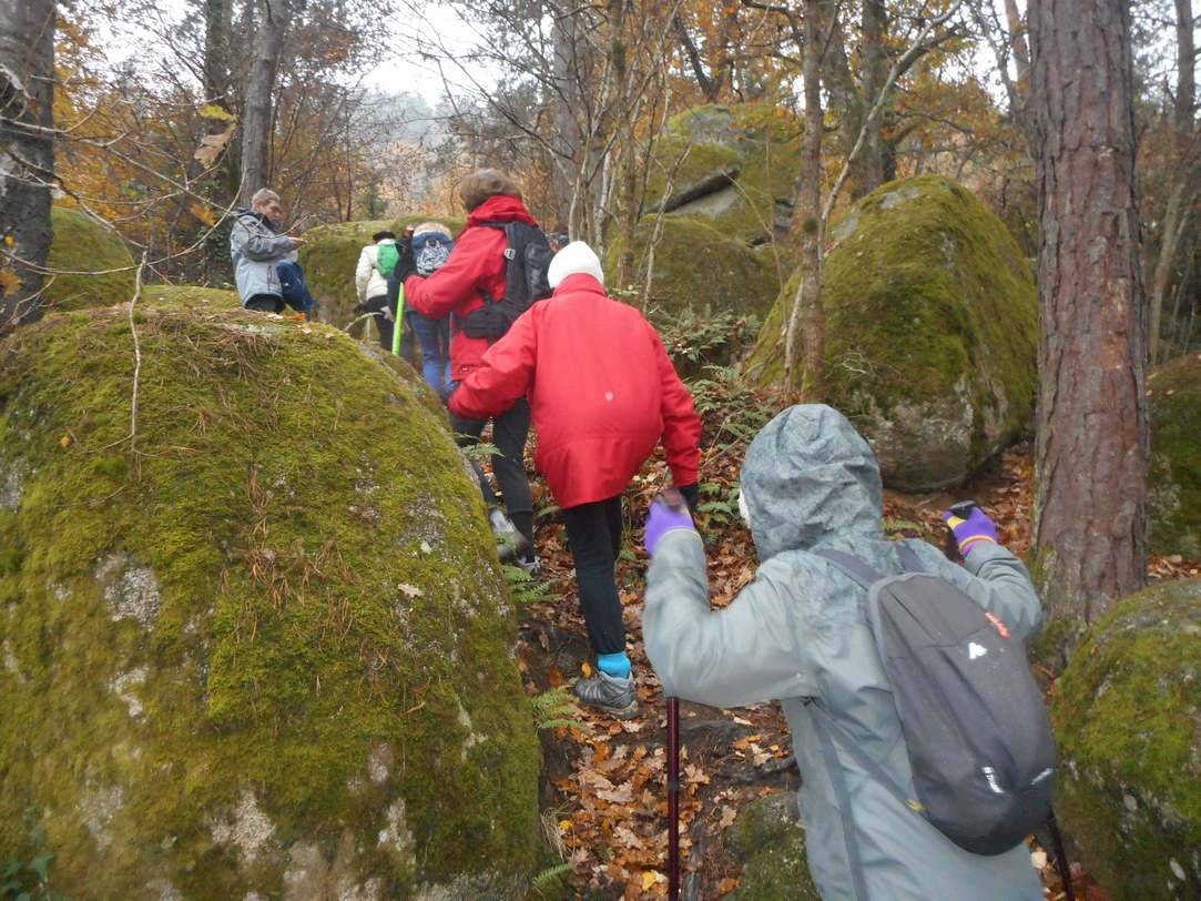 Mercredi 30 novembre : Le temps est gris mais pas notre bonne humeur en partant de Chanonat, vers le Sud puis vers l’Ouest. Nous sommes au-dessus de l’Auzon et sur l’autre versant, nous voyons la jolie chapelle qui borde la route de Varennes puis le château de la Batisse et ses jardins. Nous montons dans le bois sur la montagne de la Serre, sur le plateau, nous sommes à découvert jusqu’au grand domaine de Chagourdat dont nous admirons quelques chevaux. Nous redescendons dans la forêt et au grand carrefour de chemins et de ruisseaux, le grand arbre, dit-on, protège le site du Chaos de Flore : c’est un phénomène géologique propre au granit, impressionnant, même si pour nous il n’a plus de caractère sacré… Nous traversons l’Auzon, qui alimentait les deux moulins, Nord et Sud, de Flory, dont il ne reste que quelques ruines. Nous repartons vers l’Est, longeons un plan d’eau, traversons la route et contournons le puy de Cimard. “Fontrouge” est une source ferrugineuse sur le chemin et si les lointains sont dans la brume, nous voyons tous les villages perchés de ce paysage accidenté : La Roche Blanche, Opme, le Crest… A la descente sur Chanonat, le marché permet quelques achats gourmands ! Beau circuit, merci Claude !