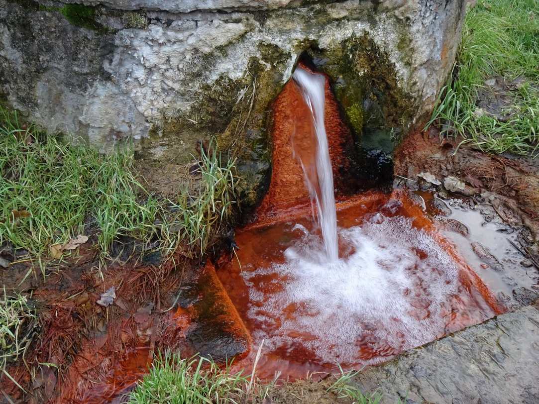 Jeudi 28 avril : À Randanne, on passe devant la carrière du puy de la Toupe et un peu plus loin, un grand parking nous permet de nous garer bien qu’il y ait déjà un autre groupe de marcheurs et même un autocar : de tout jeunes enfants prennent comme nous la direction du puy de Combegrasse au pied duquel nous voyons la cabane du télescope et… beaucoup de moutons ! Nous passons au Nord de la Garandie et montons doucement vers le puy de l’Enfer pour redescendre le long de la narse d’Espinasse. Le petit ruisseau qui traverse la narse est tout rouge (ferrugineux ?) et il rencontre un ruisseau d’eau claire. De l’autre côté du chemin, le nouveau ruisseau a une couleur mêlée et plus au Sud il se jette dans la Veyre. À Espinasse, nous remontons Nord-Est au milieu des prés pleins de grands troupeaux de bovins : l’herbe est verte, les fleurs de pissenlits sont partout, et surtout le paysage est toujours vaste, c’est un lieu idéalement situé entre la chaîne des Dômes et le Sancy, et par beau temps, quelle belle balade, merci Guy !