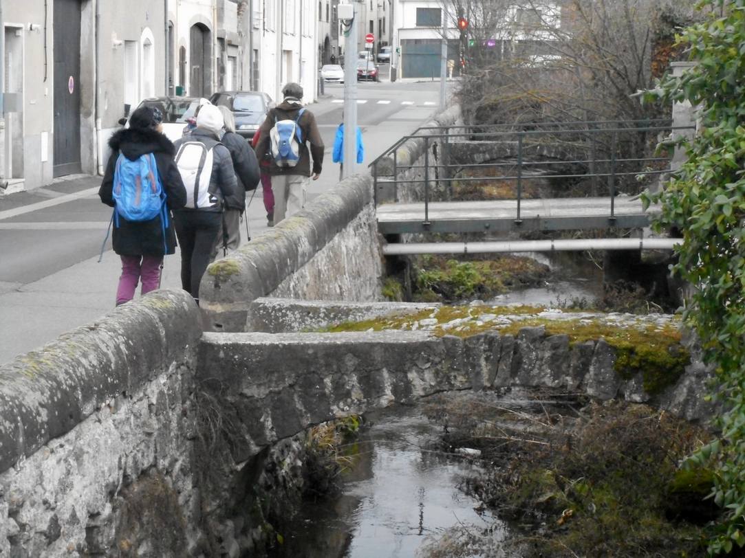 Mercredi 7 décembre : Au Nord de Riom, nous nous garons dans une rue résidentielle et partons par de grands chemins de plaine, mais à notre gauche, le plateau de Madargue est presque entièrement revenu à des plantations de vigne. L’eau est partout : dans un jardin, un vieux puits, en face, le Sargon est bordé de petits joncs (Georges se dit un… Grangeon !), nous suivons le ruisseau et on le voit passer au-dessus de la Limagne (la rivière) sur un pont canal. Nous longeons alors la Limagne et notre petite route passe sous deux ponts à quelques mètres l’un de l’autre : au-dessus de nous, deux voies ferrées qui se rejoignent bientôt à la gare de Riom, l’une qui monte au Nord, l’autre qui part vers l’Est. A cet endroit, le Sardon et la Limagne confluent avec l’Ambène, étonnante confluence de trois rivières sur lesquelles il y avait autrefois de nombreux moulins. Le plus important est au Moulin d’Eau, alimenté par un bief de l’Ambène, et nous allons suivre la “coulée de l’Ambène”, joli chemin arboré qui traverse Riom et va jusqu’à Enval. Nous la quittons pour un parcours dans Riom (le Beau) et Mozac d’où nous revenons vers le Nord pour arriver à la chapelle de Saint-Don, massive et claire, tout près de notre parking. C’est un circuit plein de surprises, peu habituel, très diversifié, merci Claude !