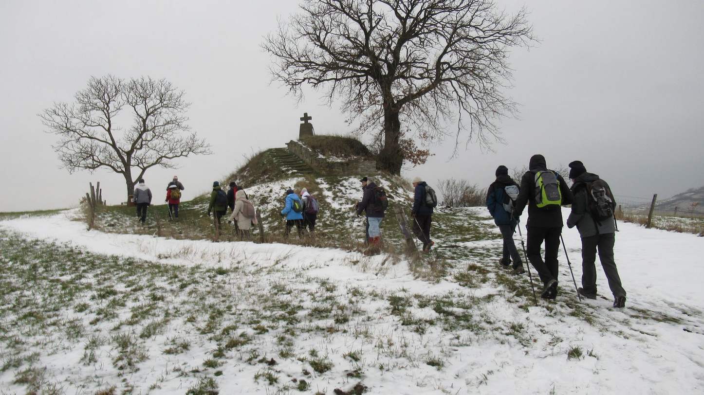 Jeudi 16 mars : Il y a de nouveaux parkings à l’étang des Pèdes : ceux qui sont allés sur l’ancien, bien connu, rejoignent ceux qui ont innové et tout le groupe part vers Orcet pour un parcours d’abord urbain, puis champêtre, mais surtout historique où se croisent plusieurs époques. D’abord, une croix remarquable du XIII ème siècle, ajourée dans la pierre de Volvic, une Vierge de la même pierre à l’angle d’une maison, et puis au cimetière l’émouvante Piéta à l’extérieur et une croix à bubons (souvenir d’une peste ?) à l’intérieur. Laissons le Moyen-Âge et la Renaissance : une croix en fer a été dressée par une famille pour honorer la mémoire d’un soldat.de la guerre de…1870 ! Nous restons à l’époque de Napoléon III, qui a fait fouiller et borner le grand camp de César, quadrilatère au pied du plateau de Gergovie. De la première borne, nous partons vers le Cendre au milieu des champs cultivés et en revenant vers Orcet, nous nous arrêtons à la deuxième borne. La ville est toute proche, sur sa butte, la vue s’étend sur la vallée de l’Allier. Par une porte des anciens remparts et les ruelles du centre, nous allons vers l’église et le château des comtes d’Orcet, mais c’est un peu plus loin que l’on peut voir le clocher bourguignon, et puis la maison natale de Georges Couthon. Joli circuit-patrimoine, merci Jean-François !