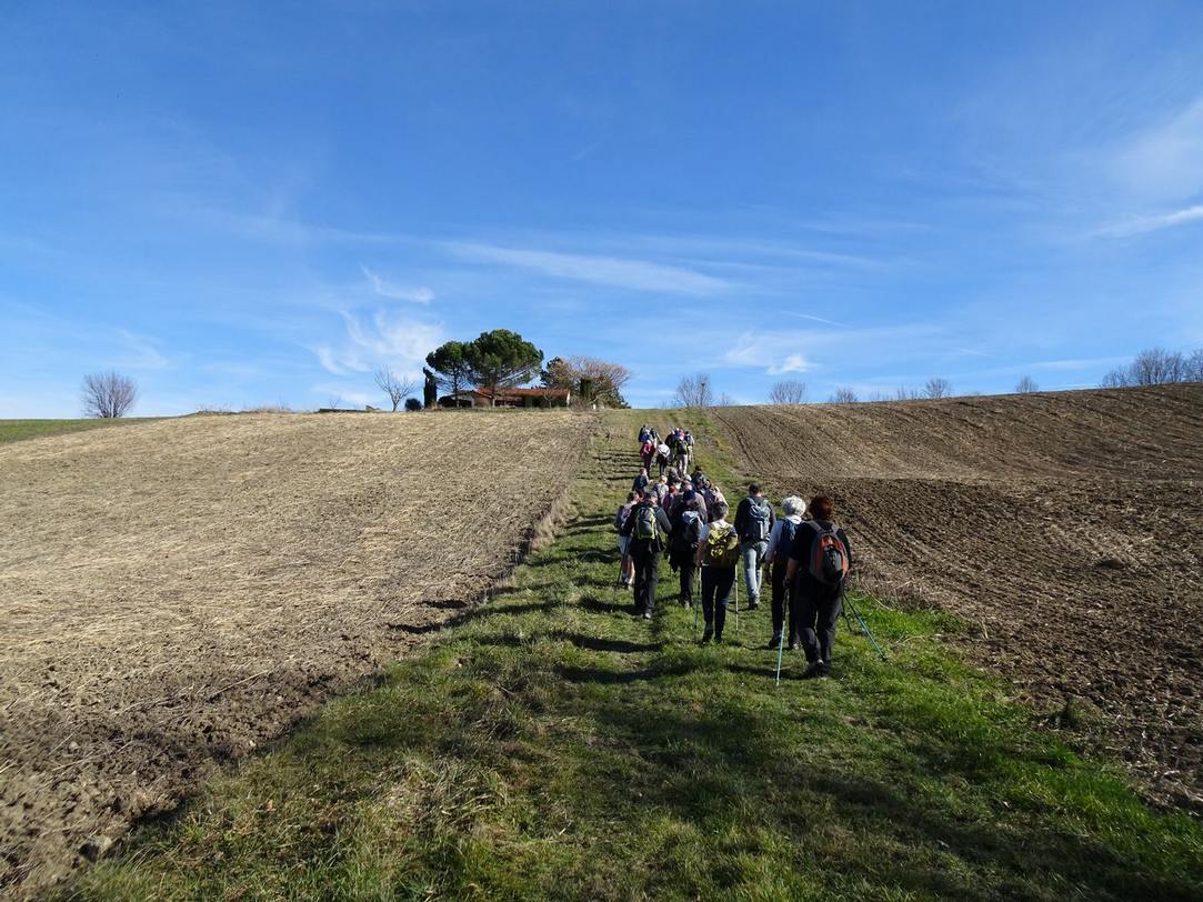 Mercredi 8 février : Départ de Flat, à l’Est d’Issoire : Vers l’Allier, les montagnes qui suivent la rive droite sont hautes et boisées, mais nous sommes dans un paysage vallonné et très diversifié qui va nous accompagner tout au long. D’abord vers le Nord, par Escoussoux et la Messandie, on monte sur “les balcons de Margot” : immense paysage vers l’Est, Pierre-sur-haute enneigé au loin et plus près la butte d’Usson, celle de Nonette, les châteaux de Peuchaud, d’Aulhat et celui de la Suchère dont il reste les remparts et le donjon où aurait séjourné la Reine Margot. Tout près de nous, dans un pré deux buses, et au-dessus de nous un magnifique milan royal. Nous allons vers l’Ouest : la Tranchère est un grand domaine agricole, nous sommes en face de Saint-Babel, de sa forêt et de celle de la Comté. Nous descendons à Naves puis les chemins remontent vers les Escures et la route revient à Flat, où l’église au clocher carré et aux courbes presque gothiques présente un beau parvis circulaire. Mais c’est surtout l’immensité du paysage dans un soleil radieux qui nous a ravis après ces semaines de grisaille, merci Claude !