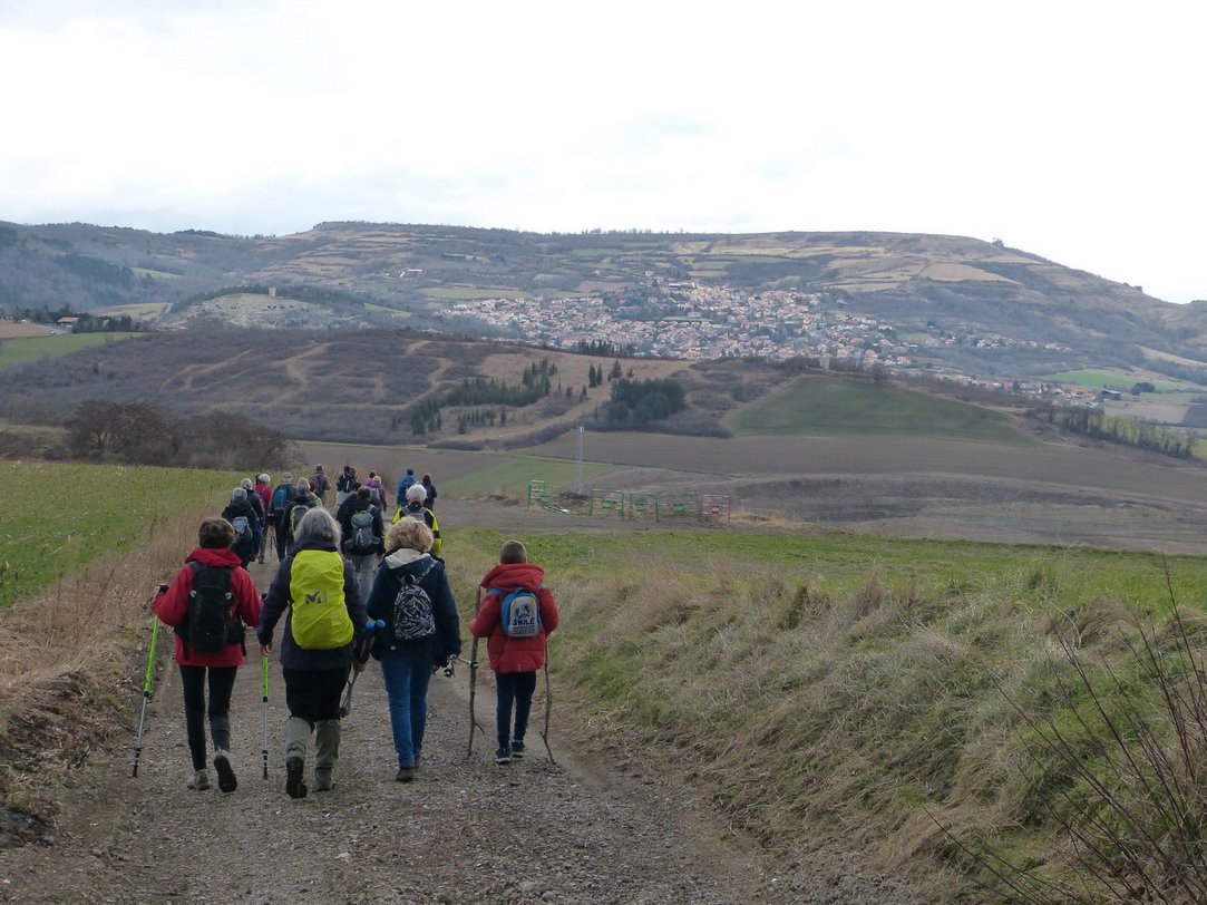 Mercredi 15 février : Rendez-vous au pied de la Roche Noire, nous grimpons dans la ville, d’abord près de l’église puis vers des remparts où une tour a été restaurée et étayée. Bientôt hors des maisons, le paysage se découvre : le site de l’écopole de l’Allier, Cournon au-delà, le puy de Mur, les deux turlurons… Nous allons vers l’Est jusqu’à Saint-Georges sur Allier au milieu des terres agricoles, mais après le bourg nous entrons dans le bois du Montfouilhoux. Il faut monter un bon moment en pleine forêt, mais avant le sommet déjà la vue se dégage : le Sancy enneigé, toute la chaîne des puys, mais c’est tout en haut que l’on voit très loin, jusqu’à la Margeride, et le tour du mont permet d’embrasser tout ce que la montée nous a découvert. Nous redescendons à travers bois, quelques montées encore et de grandes descentes empierrées sur le bord du puy de Saint-André nous conduisent à une grande allée herbeuse en face de Mirefleurs, et une petite route nous ramène à la Roche Noire. Les points de vue se méritent, mais quels paysages, et par beau temps ! Merci Claude !