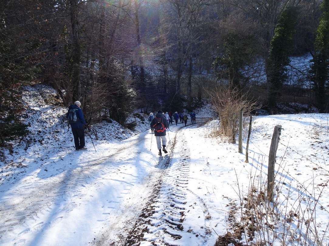 Mercredi 25 janvier : Il fait bien gris mais nous sommes un bon groupe à vouloir marcher malgré la neige ! Au départ du vieux village de Saint-Yvoine, nous montons jusqu’à l’église mais elle est au fond d’une impasse, sans “place de l’église”…. Il faut donc revenir sur le rocher de la butte contre lequel se sont construites des maisons et grimper vers une croix où le panorama est magnifique : à l’Est la vallée de l’Allier dominée rive droite par les montagnes que l’on voit de l’autoroute et de la voie ferrée, derrière nous, l’église, à l’Ouest le village plus récent au lieu-dit “le Pougelet”, et au-delà le Puy Neyrand, (par temps clair, on aurait le Sancy mais ce jour il est dans la brume), au Nord, le château d’Aubeyrat et le domaine de Sarlant. Nous descendons dans la vallée du ruisseau de Boissac (dans le bois, une petite descente nous amène à l’entrée d’une grotte profonde qui était une carrière de pierre ponce), nous le traversons puis revenons sur l’autre rive. Nous évitons de monter sur le plateau pour ne pas risquer le verglas, mais nous n’avons pas eu froid au fond de la vallée abritée et ce lieu est une belle découverte, merci Claude !