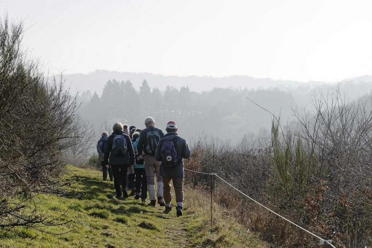 Mercredi 11 janvier : Malgré le temps incertain, nous sommes presque une trentaine et nous nous retrouvons sous l’ancien pont métallique de Coudes, garés au bord de l’Allier, bien haute, qui reçoit ici la Couze Chambon, elle aussi bien remplie des dernières pluies en montagne. Nous traversons la vieille ville de Coudes : des maisons souvent restaurées, de petits passages étroits et couverts… Nous passons sous l’A 75 et remontons le cours de la Couze, canalisée parfois en biefs d’irrigation au-dessus de sons cours. Et nous montons sur le coteau pour prendre Sud-Ouest un grand chemin de crête : immense paysage (Plauzat, Neschers, Chadeleuf…) où nous rattrapent quelques gouttes de pluie. Nous redescendons vers la rivière, passons devant un chenil hurlant et une haute maison de vigne en arkhoze bien restaurée (avec sculpture d’un couple de nus) et dans la vallée, nous traversons la Couze. Nous grimpons dans le bois de la rive droite et au sommet, le soleil tamisé par quelques nuages éclaire lumineusement Montpeyroux, Monton, Parent, et plus loin Buron et sa citadelle. Le chemin rejoint la petite route de Sauvagnat que nous suivons jusqu’à Coudes, d’abord près de sa source ferrugineuse puis sur l’ancien pont de pierre, et enfin au confluent de la Couze et de l’Allier. Quel beau circuit, très divers, par un temps idéal pour marcher, merci Claude !