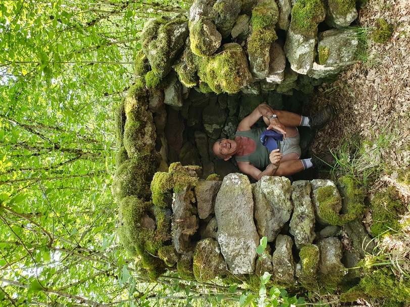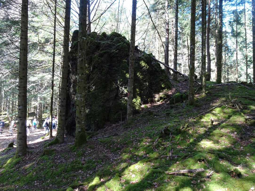 Dimanche 17 septembre : Nous nous retrouvons aux Roches, un joli village à l’orée de la cheire de Côme, et il est très agréable de s’enfoncer dans la forêt ombragée dans ces chemins parfois anciens (bordés de murets moussus) parfois forestiers. Mais surtout, les chemins traversent le chaos des blocs de la coulée de lave du puy de Côme, tout recouverts aussi de mousse bien verte, et ils montent et descendent dans une végétation luxuriante. Nous arrivons à la Pierre Signée dont l’interprétation des traits gravés depuis bien longtemps est toujours aussi mystérieuse… même une taupe s’y est penchée ! (il ne reste que la taupinière.) Le chemin longe une carrière de basalte à nouveau exploitée, puis croise les pistes qui rejoignent le Petit Chambois près d’une dépression où d’anciennes cabanes de bergers témoignent qu’il y avait là des pâturages. Plus loin, ce sont des captages d’eau et nous nous rapprochons de l’enclos de Vulcania avant de revenir aux Roches par une petite route où la pluie nous rattrape en fin de parcours alors que la chaleur se faisait sentir un peu avant même en sous-bois. C’est un lieu qui nous enchante toujours, merci Claude !