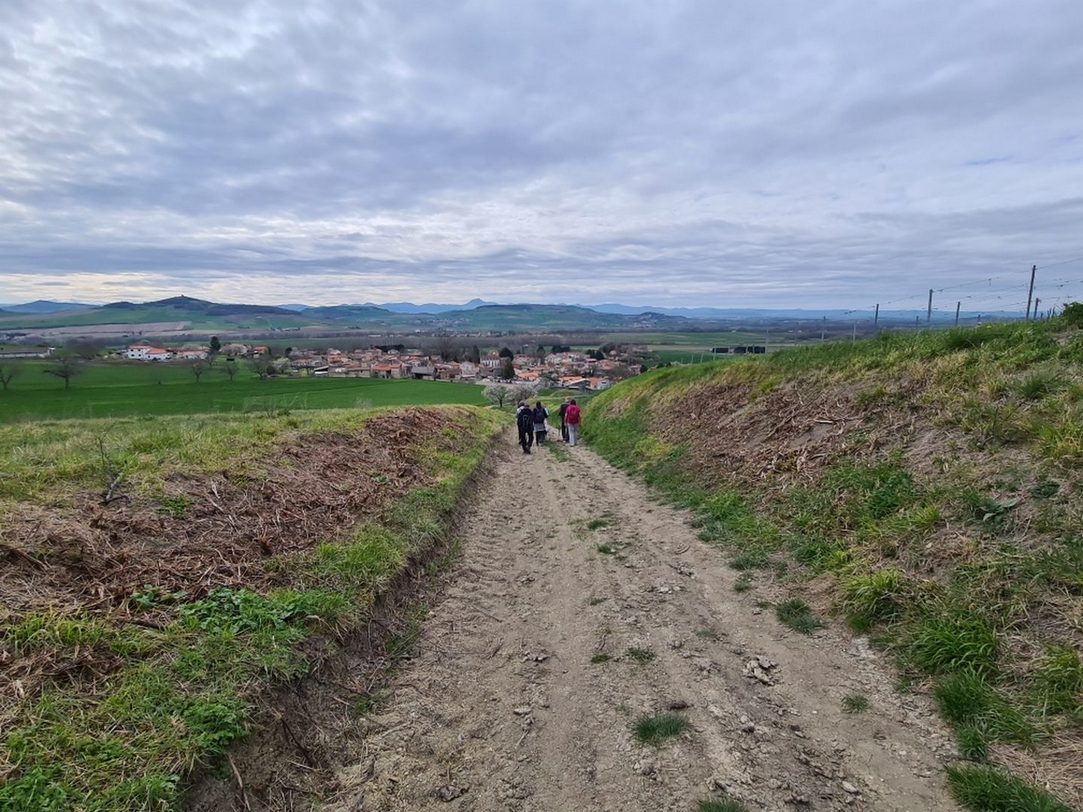 Mercredi 22 février : Le temps trop incertain nous interdit d’aller en montagne, nous resterons entre les collines du Sud de Clermont au départ du grand parking de covoiturage de Tallende. L’A 75 est tout près, et quand nous partons vers le Nord, nous mesurons l’importance de la circulation, et quelques chauffeurs de camions nous saluent, eux lancés à toute vitesse et nous au rythme de nos pas ! Nous nous éloignons de l’autoroute vers l’Ouest pour suivre la rive droite de l’Auzon, puis vers l’Est sa rive gauche au milieu de jardins et de vergers. Nous sommes au pied de la Roche Blanche dont on voit bien les grottes et la falaise, du Crest avec son clocheton, et lorsque nous avons franchi la grande voie routière sous un tunnel, ce sont Orcet et son clocher bourguignon, et les Martres de Veyre. Après avoir traversé la route du Cendre, nous sommes sur la pente de Monton et l’on voit de temps en temps la grande statue blanche de la Vierge entre prés cultivés et grandes maisons. Le retour au parking est facile et rapide, la pluie nous a épargnés et le paysage des collines à l’Ouest de l’Allier est riche de nombreux vieux villages, merci Claude !