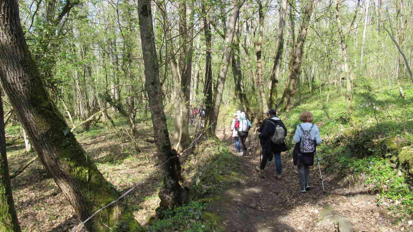 Jeudi 20 avril : Rendez-vous à Marsat, dans ces environs de Riom au riche passé : comme Mozac ou Volvic tout proches, c’est un site clunisien avec aussi un sanctuaire marial. Du centre ville, il suffit de quelques centaines de mètres entre de belles maisons pour se retrouver le long de la Rivaux et même au-dessus d’un ravin vers un endroit réputé bien froid : “la petite Sibérie” ! Nous arrivons au hameau des Ratiers dont le domaine date du XVI ème siècle, à l’entrée duquel une croix récente est surprenante. Nous contournons le puy de Marcoin par l’Ouest et le Sud et au chenil de la Bulle, nous montons vers le sommet sans aller tout en haut : près d’une autre croix récente elle aussi, nous suivons un grand chemin à découvert (vue sur Malauzat, Chateaugay), puis un sentier qui descend dans la forêt de Marcoin. Il y a des tapis de pervenches dans le sous-bois, et en arrivant à la Fraisse, des coucous dans les prés où paissent de beaux chevaux. Là, en face de nous, c’est le château de Tournoël. Quel beau circuit par beau jour de printemps, merci Bernard !