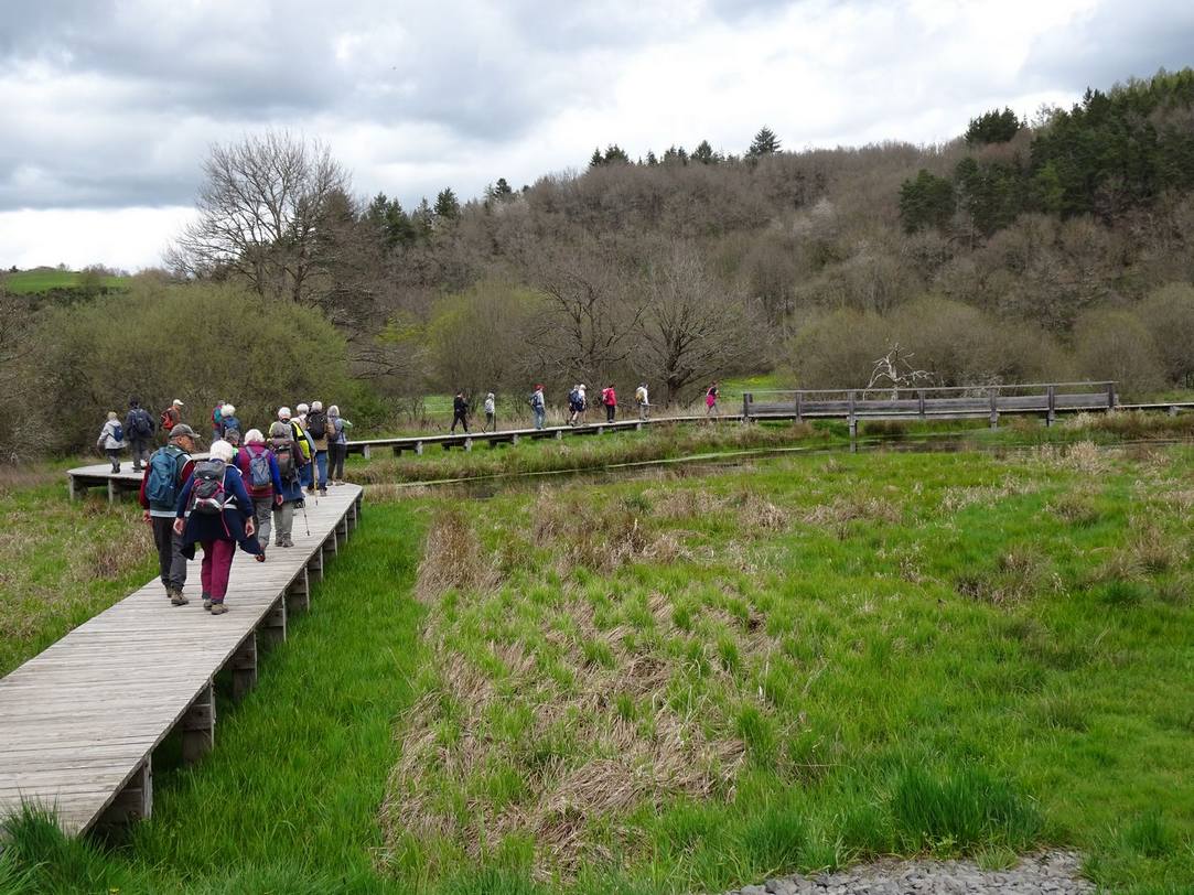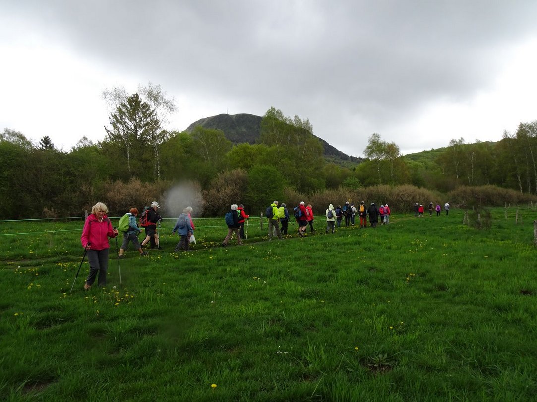 Mercredi 26 avril : On gagne Mazaye par les petites routes de l’Ouest du Puy de Dôme, la mairie-gîte est à égale distance entre le bourg et Mazaye-Basse où se trouve l’église et une ancienne fontaine cressonnière. Et l’on passe devant des croix de pierre, presque à chaque carrefour des chemins qui suivent la vallée du ruisseau de la Vergne, bordée de basalte tailladé en blocs ou en strates. En face de nous, l’église de Saint-Pierre-le-Chastel est sur son promontoire au-dessus de la vallée de la Sioule, mais nous arrivons par le bas de la ville après avoir longé un moment la voie ferrée. Nous descendons vers la narse du ruisseau de Mazaye, immense zone humide qui peut être totalement inondée : on la traverse sur des passerelles en caillebotis, d’où l’on peut voir la végétation aquatique qui la couvre, et l’on monte au village de Bannières. Comme dans toutes les Combrailles, beaucoup d’anciennes maisons en pierre sont restaurées, les fermes sont importantes avec dans les prés de gros troupeaux de vaches, et des pissenlits à perte de vue ! Nous devons longer un pré parce que le chemin n’est pas entretenu et même condamné, mais il conduit à un plateau où la vue est belle : le Puy de Dôme et celui de Come tout près, et au loin vers le Sud le Sancy et le puy de l’Ouire. Une petite route nous ramène à Mazaye-Basse (l’auberge de Mazaye est toujours là !) et l’on remonte vers la mairie. C’est une boucle magnifique par temps de printemps, merci Claude !