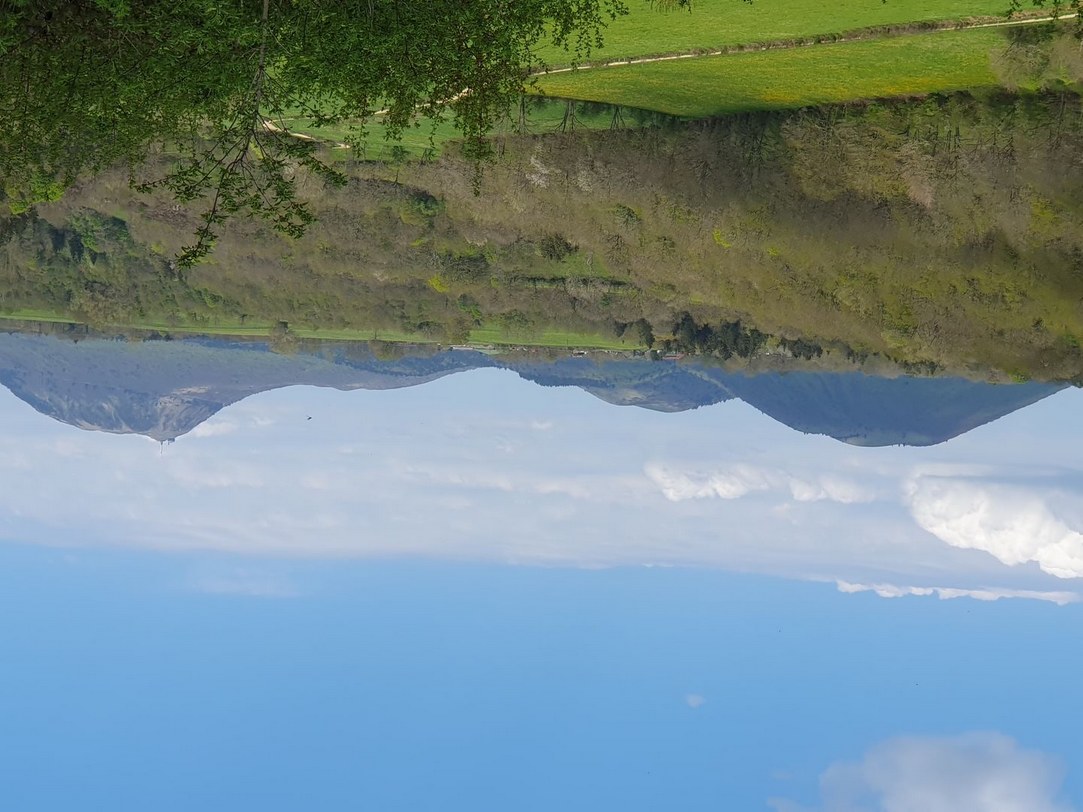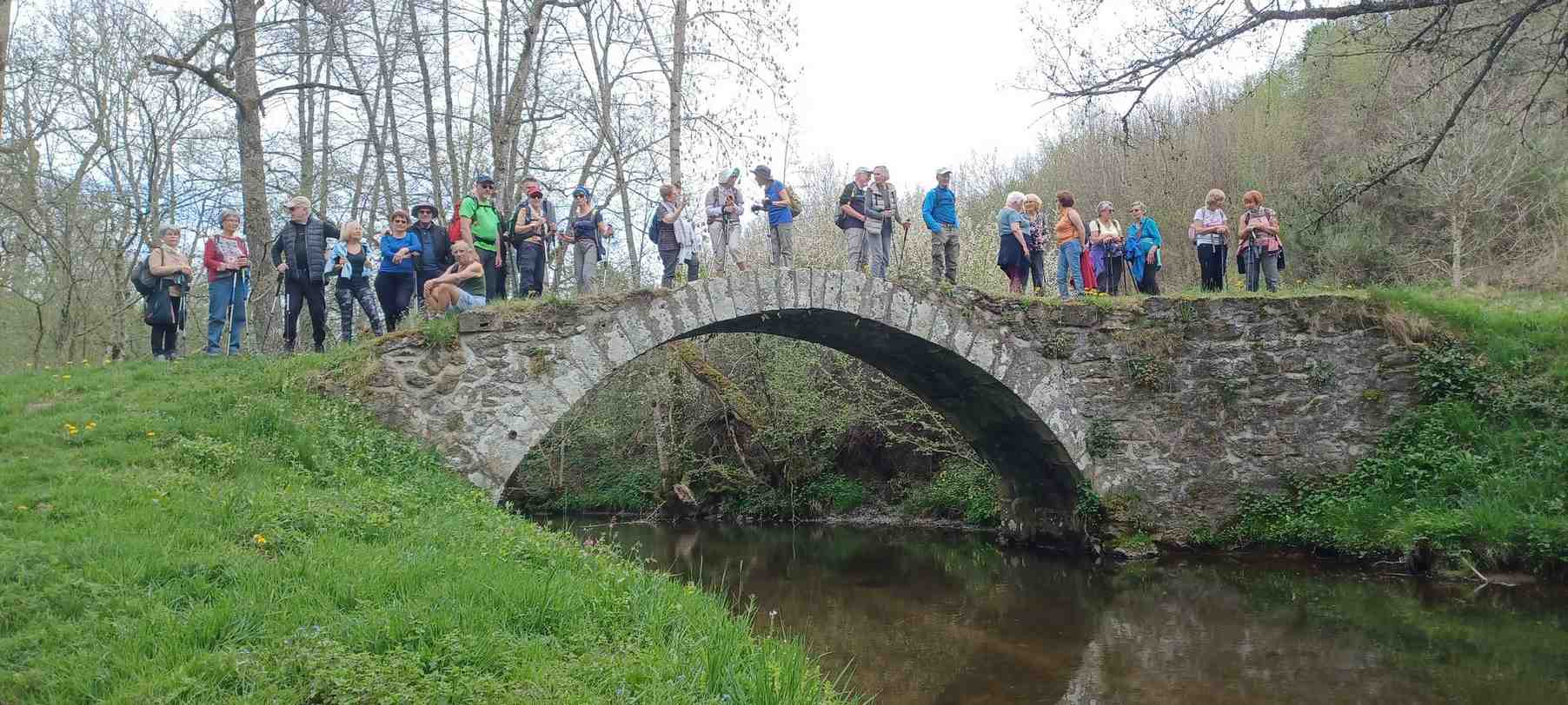 Dimanche 30 avril : Le parking du Léry est au pied de Saint-Pierre-Roche et pour traverser l’ancienne RN 89, il faut emprunter un passage à bestiaux… Dans le hameau, après être passés devant four banal et fontaines, on grimpe doucement jusqu’au moulin des Prades et l’on suit le chemin qui longe le Sioulot. Il y a une cascade, le Sioulot est aurifère et sa rive est bien agréable jusqu’au moulin de Monteillet où il se jette dans la Sioule. Le confluent est très visible au niveau d’un pont, nous continuons vers le Nord avant de bifurquer vers le Sud en direction du Glavin. Un joli pont de pierre à une arche en bosse franchit la Sioule et le chemin continue vers le Bouchet. Après ces vallées nous sommes à nouveau en hauteur et le paysage se découvre comme à la sortie du Léry : Saint-Pierre-Roche, la Banne d’Ordanche, le puy de l’Ouire et le Baladou, la chaîne des puys et en deçà de tout cela, d’immenses prés avec vaches de différentes races et mouton de la race Rava, au milieu des étendues jaunes de fleurs de pissenlits, et sur le bord des chemins, des pervenches, des myosotis, des coucous, des orchis, des cardamines, des violettes et tant d’autres ! Quel beau circuit, merci Claude !