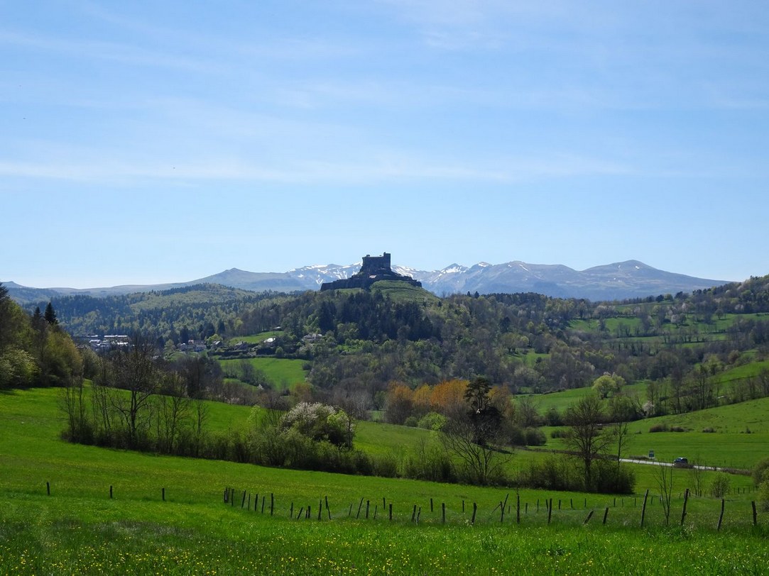 Mercredi 3 mai : Grand beau en ce début de mai : avant d’arriver à Saint-Nectaire déjà, en passant à Sailles, cette vallée du ruisseau de Frédet dominée par le mont Cornadore et sa superbe église romane, avec Murol et Sancy en fond, est magnifique… Nous nous retrouvons nombreux au-dessous de l’église, grimpons sur le mont, redescendons dans la ville basse et prenons le grand chemin de la Croix Saint-Roch. En montant, nous croisons la source ferrugineuse de Giraudon, vers le Nord on voit les grottes de Chateauneuf, vers l’Ouest le château de Murol se découpe sombre devant le massif du Sancy piqué de quelques points de neige. Avant Sapchat, c’est la Roche Romaine en face de nous et après avoir suivi un peu la Couze Chambon, le dolmen de Sapchat s’impose ! Un chemin indique “les Couverts”, il conduit au Granges et contourne le puy d’Éraigne. Nous sommes dans la forêt, pas très dense : soleil et ombre, petit vent frais qui tempère la chaleur du jour, et bientôt, on domine Saint-Nectaire-le-Bas. En arrivant sur le pont qui franchit le ruisseau, l’église côté narthex est aussi belle que du côté des chapelles rayonnantes sur ce mont fait pour elle… Le Casino, la fontaine pétrifiante, les anciens thermes, et nous rejoignons le mont Cornadore, cette fois le long de la nef de l’église. Un petit escalier nous ramène au parking. Ce lieu est un des plus beaux sites d’Auvergne, nature luxuriante, patrimoine d’art sacré, et terroir du fromage ! Tout cela au printemps, que c’est beau, merci Claude !