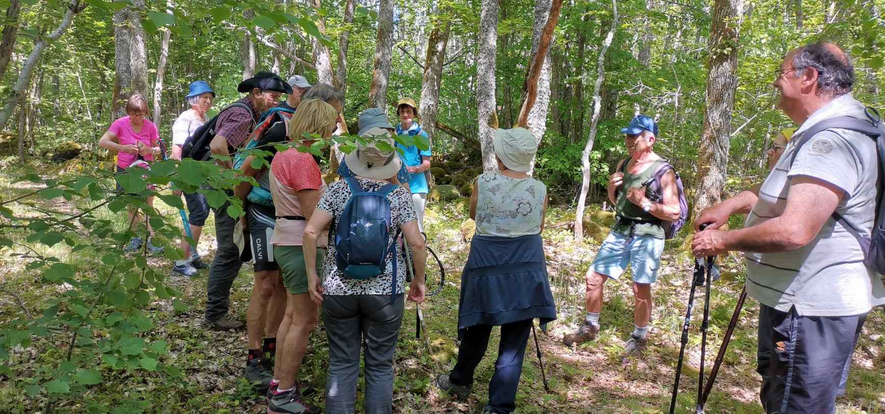 Sous le vent, 27 marcheurs longent la rive droite de l’Étang Grand. Après un arrêt dans un observatoire pour les oiseaux, nous admirons l’eau qui miroite sous le soleil. Nous franchissons l’A89 par un pont supérieur, direction le hameau de Chazelle, où Fanny nous dévoile son anatomie.