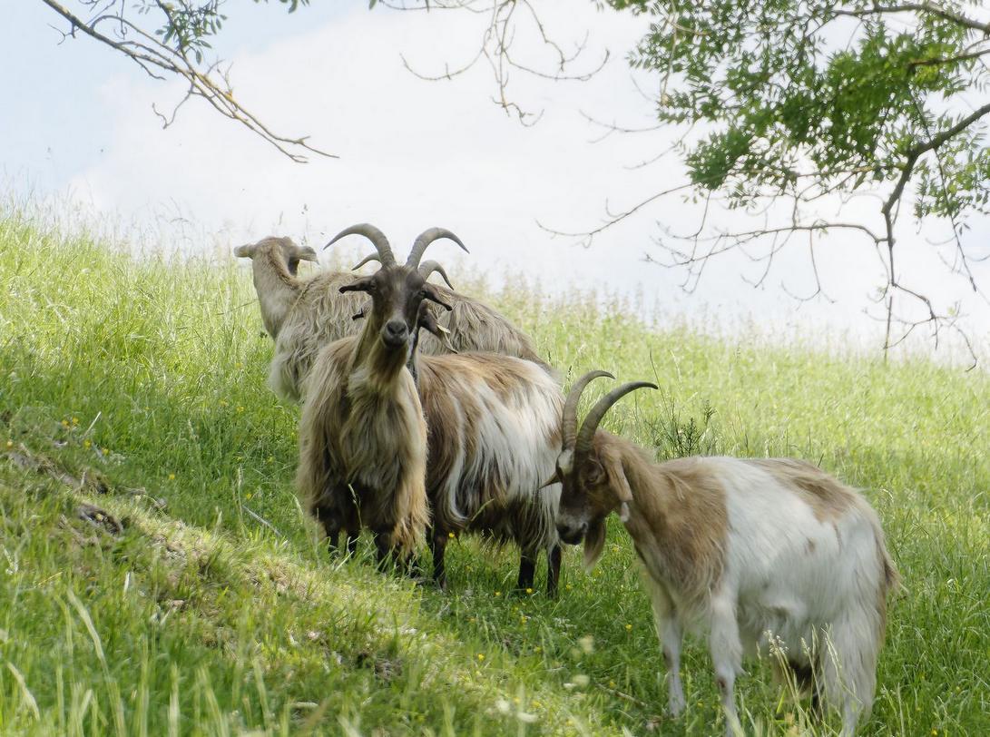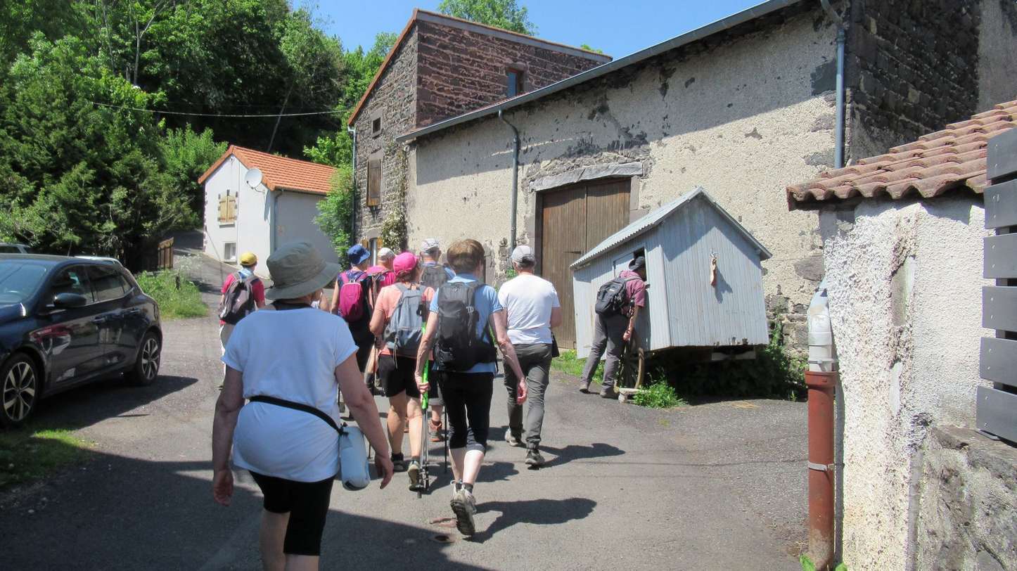 Une première côte nous amène à St Pierre le Chastel par un chemin bordé de strates de basalte et où fleurissent myosotis et orchidées. Arrivés au village ‘’Place des médailles’’ , on découvre la maison d’un éleveur de vaches charolaises où toutes les plaques des prix reçus pour ses concours sont accrochées sur un pan de sa maison.