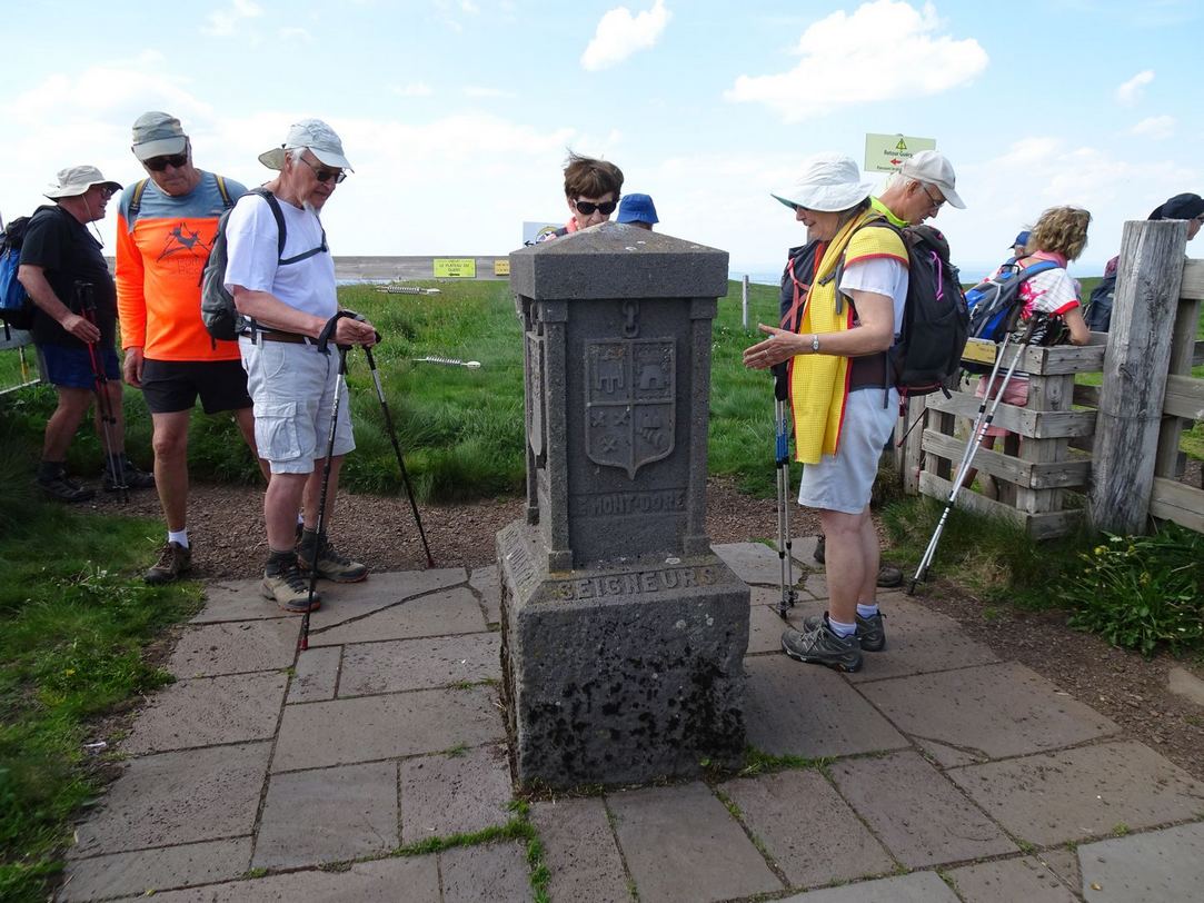 Mercredi 7 juin : Grand beau, chaud même, c’est le moment d’aller en altitude ! Nous nous retrouvons sur le parking du lac de Guéry, un petit coup d’œil sur la belle vallée en auge entre les roches Tuilière et Sanadoire, et l’on emprunte le chemin qui longe la rive Nord du lac. On traverse le ruisseau des Mortes du Guéry qui alimente le lac et l’on grimpe dans la forêt jusqu’à la cascade imposante de ce ruisseau qui prend sa source au pied du puy Gros. La cascade tombe d’une falaise d’orgues basaltiques issues du puy May que l’on va laisser sur notre gauche après avoir franchi un escalier de clôture, la hêtraie, et pris la direction de la Banne d’Ordanche. Sur le plateau, on voit déjà le col de la Croix Morand tout proche, et le massif du Sancy. En deçà, les prés sont très verts et les fleurs d’été sont bien là ! La grande piste qui conduit à la ferme du puy May a été tracée pour la base de vol-à-voile qui s’y trouvait jusqu’en 1948 dont Pierre nous fait l’historique. Au col de Saint Laurent au pied de la Banne, (tout le Sancy, la Bourboule sont nets !) nous montons directement vers la borne des Quatre Seigneurs (de la Bourboule, Murat-le-Quaire, Perpezat, Laqueuille) puis jusqu’au puy Loup où le paysage est époustouflant : outre tout ce que l’on vient de voir, la Corrèze dans le lointain, la chaîne des puys et tout près les roches Tuilière et Sanadoire. Nous redescendons rapidement près de quelques troupeaux et retrouvons la piste principale, puis les pistes de retour de ski de fond avec habitat en cabanes… C’est bien un des plus beaux lieux de nos montagnes, merci Claude !