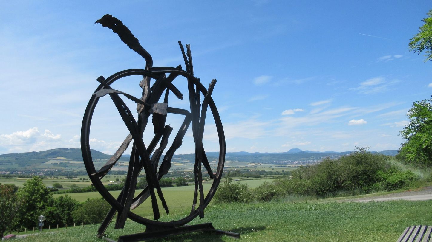 Mercredi 11 octobre : au départ près de la gare de Volvic ; toujours avec un beau soleil, 26 marcheurs, par un dénivelé de 150 mètres, arrivent au-dessus de l’ancienne carrière de pouzzolane, réhabilitée par les Eaux de Volvic. La vue sur la vallée est masquée par le feuillage (dommage !)… En continuant en sous-bois de noisetiers, nous longeons une carrière en activité (anciennes coulées de trachyandésite d’où provient la pierre de Volvic). Une bonne grimpette nous attend avant de plonger dans le cratère de la Nugère et de remonter au point culminant, 916 m, afin de redescendre jusqu’au col routier de la Nugère. La descente continue au milieu d’une hêtraie jusqu’au village des Goulots. La rando se termine par une belle visite des sculptures de M. COURTADON.