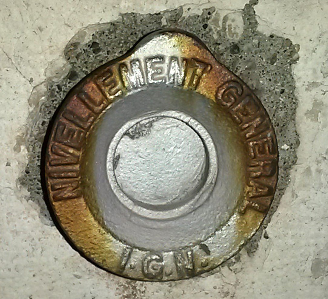 Sur les derniers repères installés par l’Institut Géographique National, la mention en haut est plus courte avec seulement «NIVELLEMENT GENERAL » et en bas « IGN ».