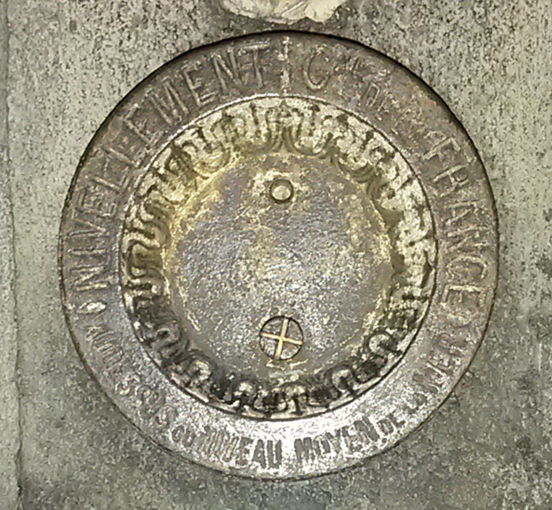 On connaît donc la hauteur du lieu où l’on se trouve d’une manière scientifique (plus haut, plus bas qu’un autre endroit pas trop éloigné) puisqu’elle est déterminée par rapport à un nivellement (niveau de base ou niveau zéro) appliquée à tout le territoire national. Il sert à calculer d’autres hauteurs proches en s’appuyant sur une mire à partir de la hauteur connue par le repère. On peut lire sur la partie haute du pourtour :