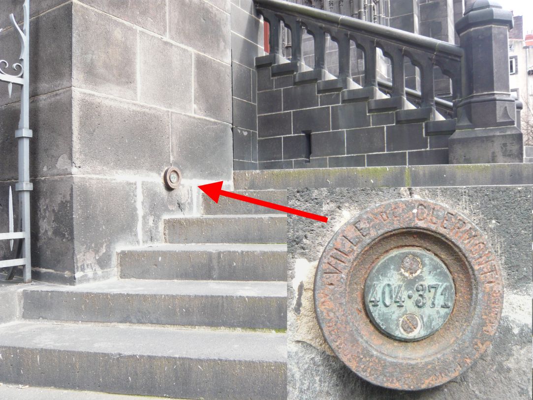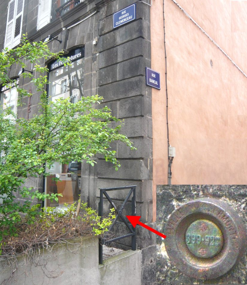 J-François : Il y en a eu 15 000 en France qui ont été implantés entre 1857 et 1864. Mais les grandes villes en ont ajouté bien d’autres. Ces repères en fonte, scellés par du ciment sur un support vertical sont cylindriques. On les trouve en priorité sur les monuments (mairies, cathédrales ou églises, bâtiments administratifs, hôtels anciens, murs de casernes) ou sur des constructions diverses (fontaines, lavoirs, ponts au dessus des rivières ou voies ferrées) ou encore sur des supports très divers (angles de certaines rues, écluses, menhirs, calvaires, etc.) Sur Clermont-Ferrand, j’arrive déjà à plus de 40 et je suis loin d’avoir terminé leur inventaire avec photos à l’appui.