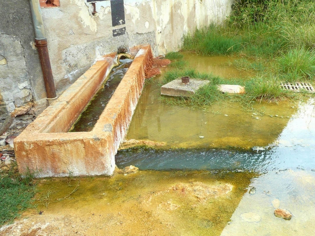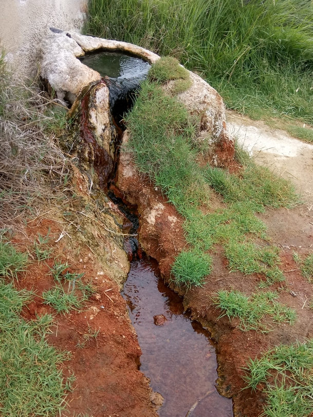 Sur l’emplacement des anciens thermes ; l’eau sort puissamment « des murs » et laisse un dépôt de couleur rouge., coulant dans un petit chenal jusqu’à l’Allier… Il s’agit en fait de dépôts de carbonates ferrugineux.