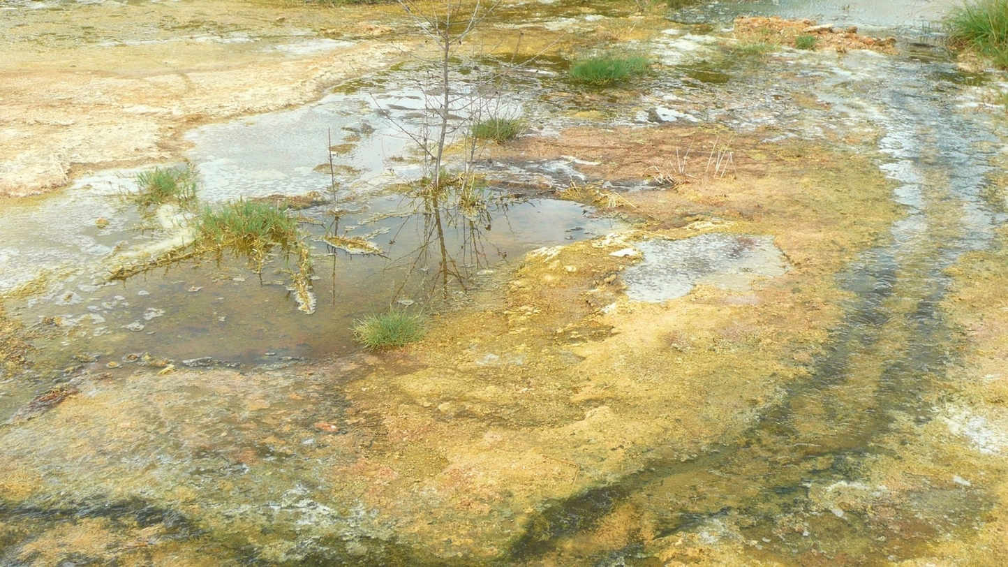 Là, pas de jaillissement… Serait-elle tarie ? Les pierres blanchies témoignent de la teneur en chlorure de sodium.
