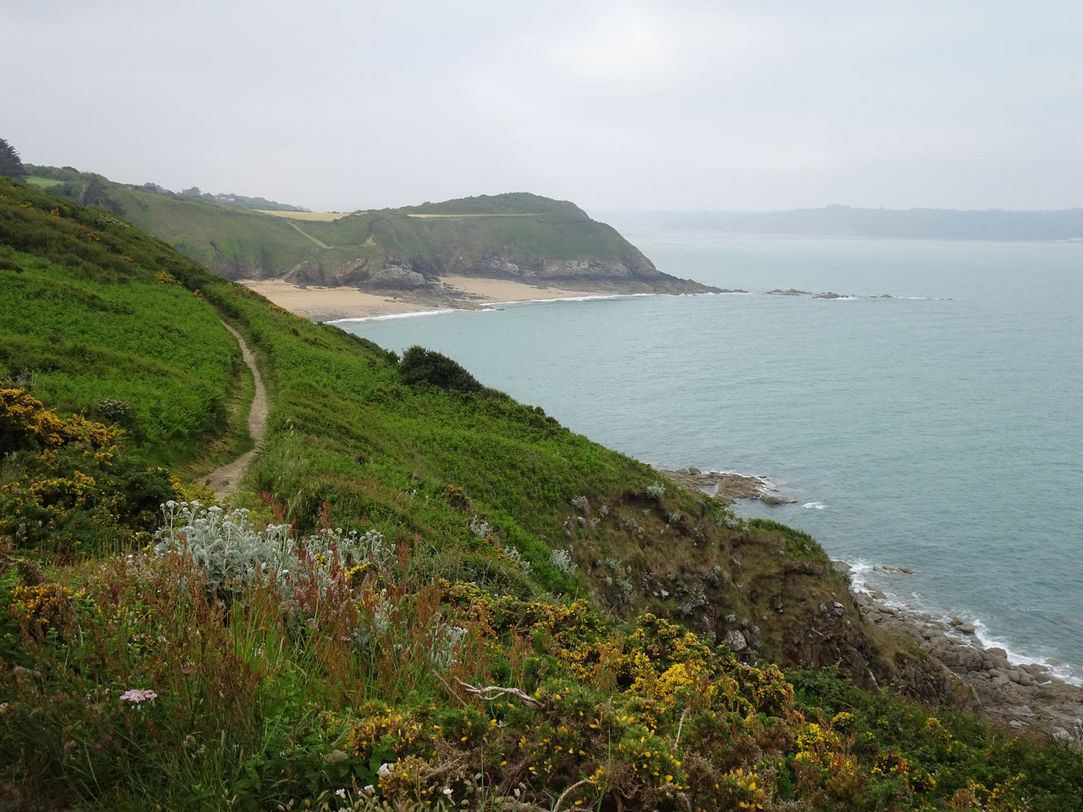 Le lendemain, retour vers l’Ouest : nous partons d’Erquy, ville balnéaire très étendue, pour marcher sur la côte entre le cap d’Erquy et les Sables d’or en face de l’îlot Saint Michel : même mer, même lande ventée, c’est toujours aussi beau ! Et puis, quand nous traversons des villes et des villages, la végétation des jardins nous ravit aussi : les rhododendrons sont en fleur, les hortensias pas encore mais promettent, et partout ces massifs de petites pâquerettes roses qui sont des érigerons que l’on dit aussi « marguerites folles ».